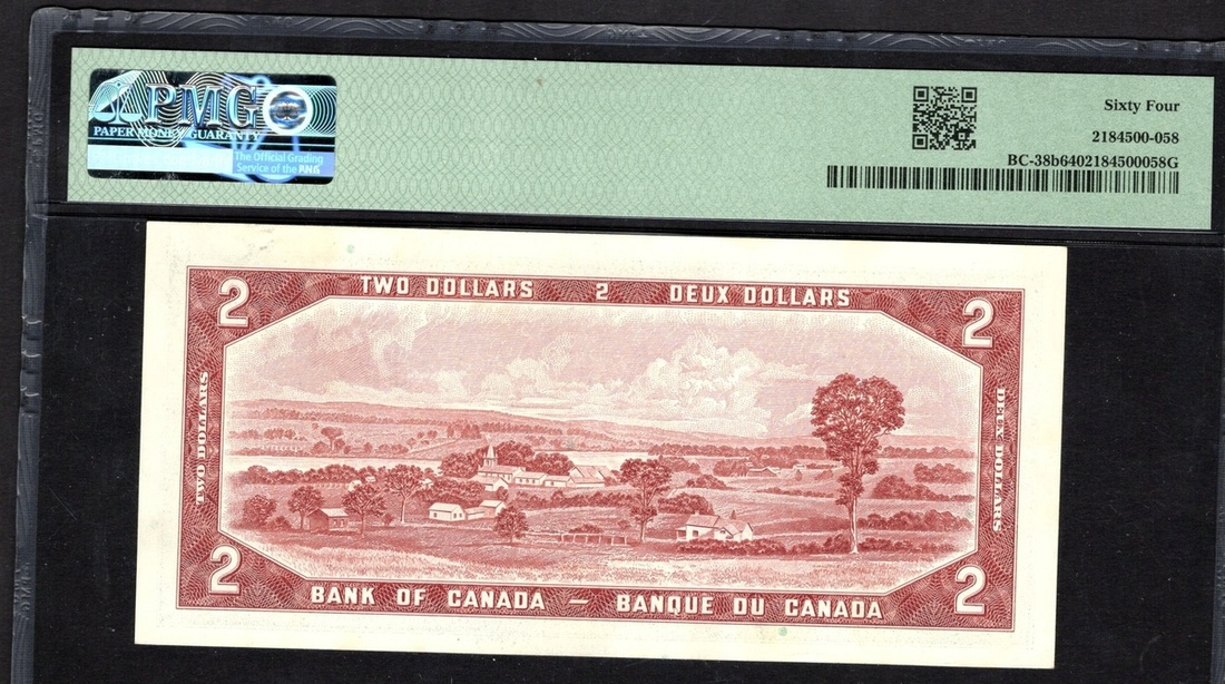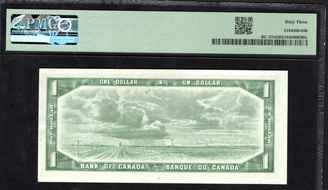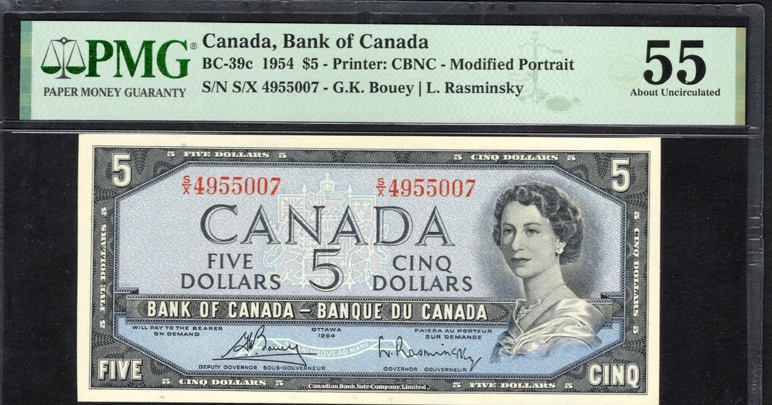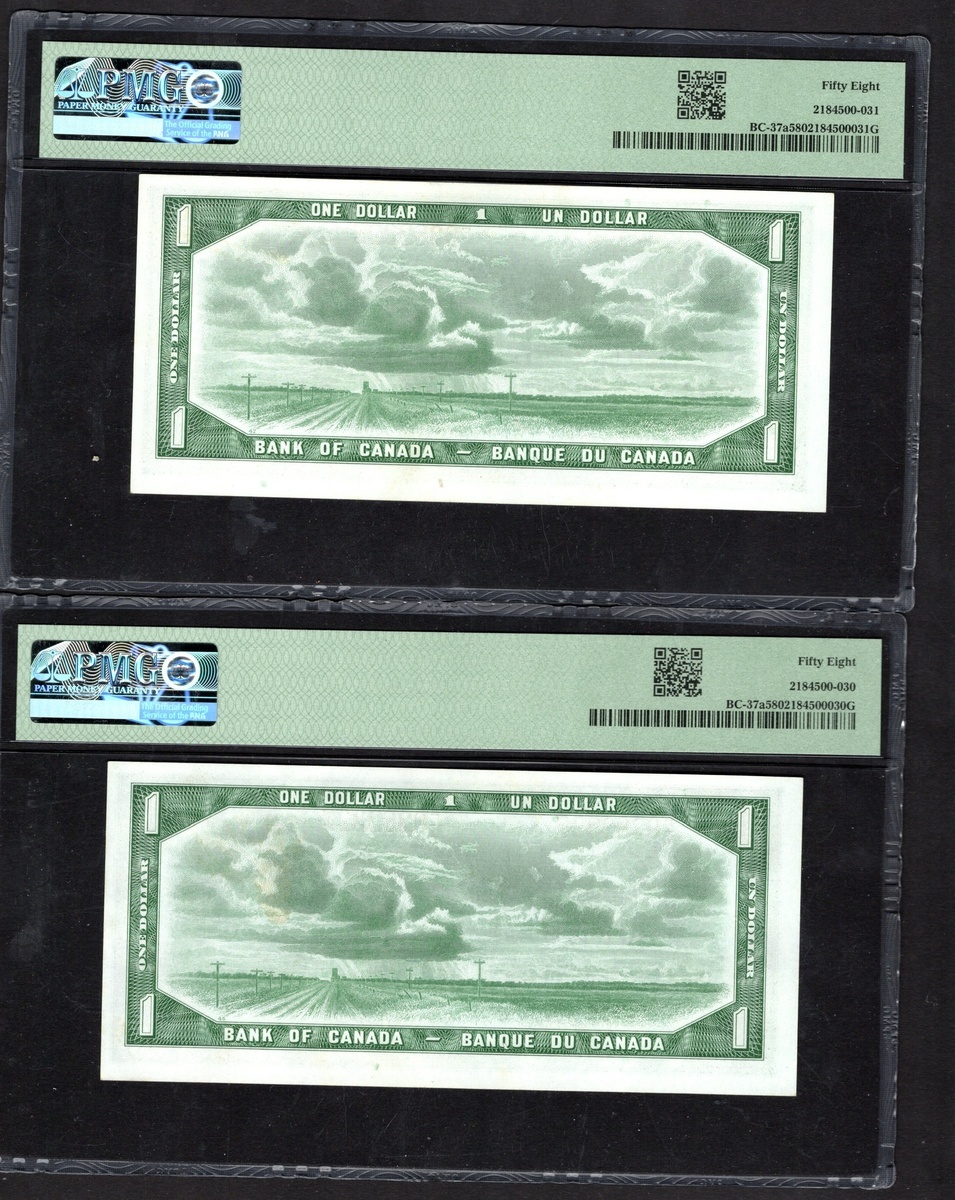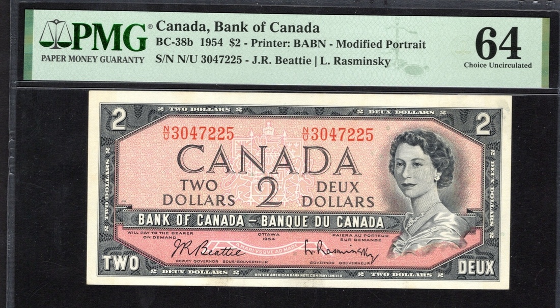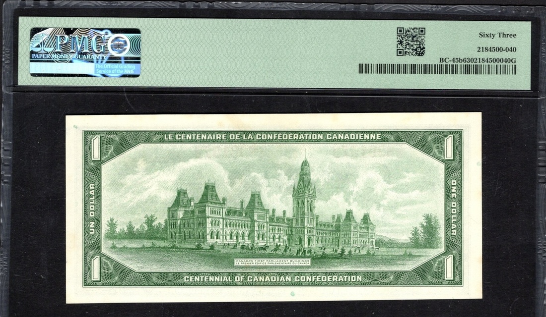 Canada. Bank of Canada. 1954 Series Lot. 1 Dollar. Signature: Beattie-Coyne (1955-61). P-75a, BC-37a (2). Consecutive. Both PMG Choice About Unc 58; Signature: Bouey-Rasminsky (1972-73). P-75c, BC-37c (2). Both PMG Choice Uncirculated 63; 1967 Commemorative issue (3). P-84b, BC-45b. Consecutive. All PMG Choice Uncirculated 63; 2 Dollars. Signature: Beattie-Rasminsky (1961-72). P-76b, BC-38b (2). Consecutive. Both PMC Choice Uncirculated 64; Signature: Bouey-Rasminsky (1972-73). P-76c, BC-38c (2). Consecutive. Both PMG Choice About Unc 58; Signature: Lawson-Bouey (1973-75). P-76d, BC-38d (2). Consecutive. Both PMG Choice About Unc 58; and 5 Dollars. Signature: Bouey-Rasminsky (1972). P-77c, BC-39c. PMG About Uncirculated 55. [14]