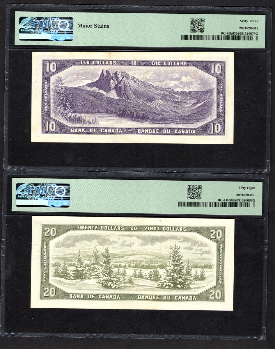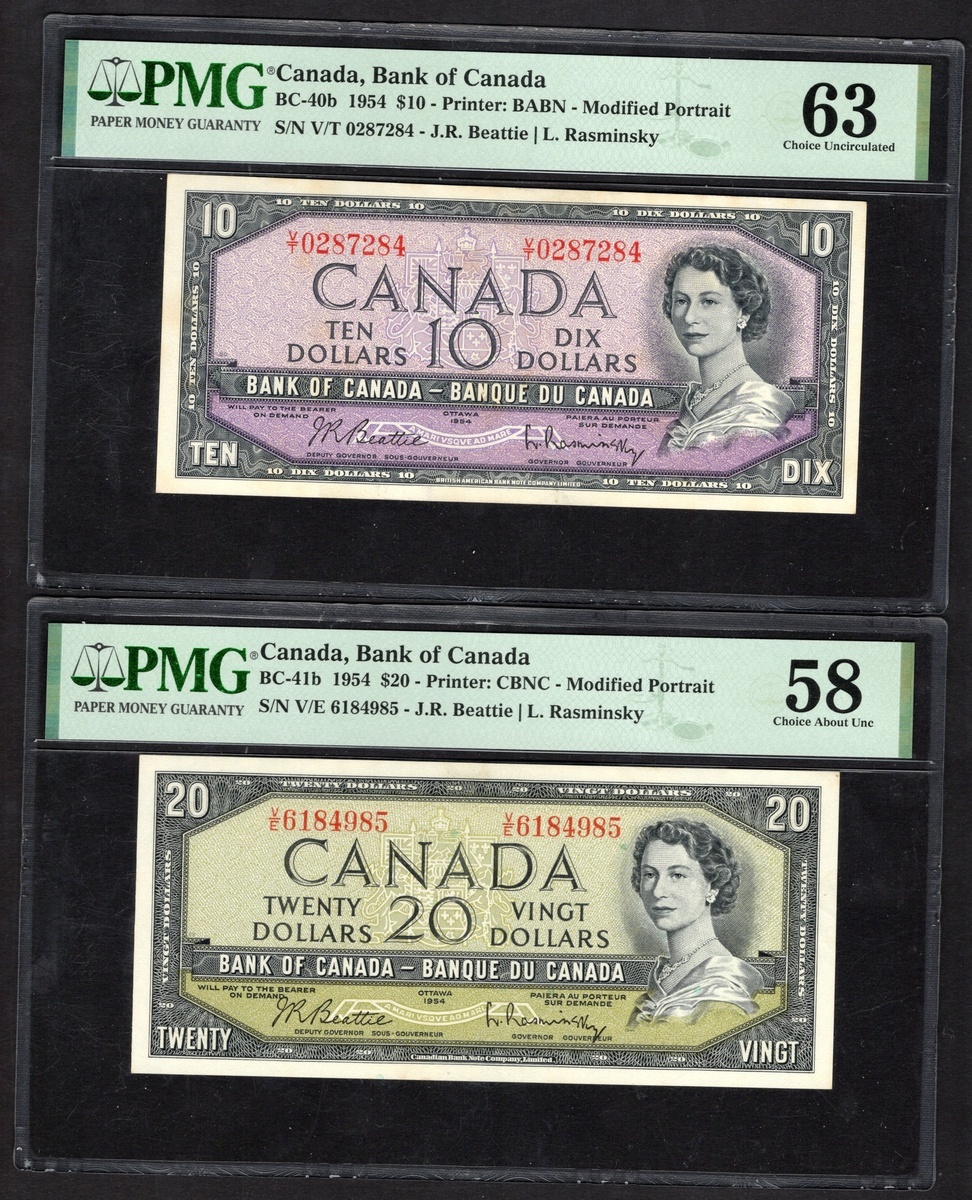 Canada. Bank of Canada. 10 and 20 Dollars. 1954 Series. P-79b, 80b; BC-40b, 41b. Signature: Beattie-Rasminsky (1961-71). Modified portrait; Rocky Mountains; Laurentian Hills on backs. The first PMG Choice Uncirculated 63, the latter PMG Choice About Unc 58. [2]