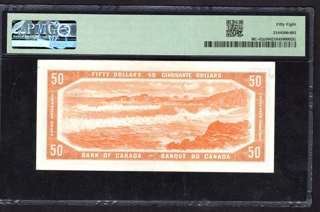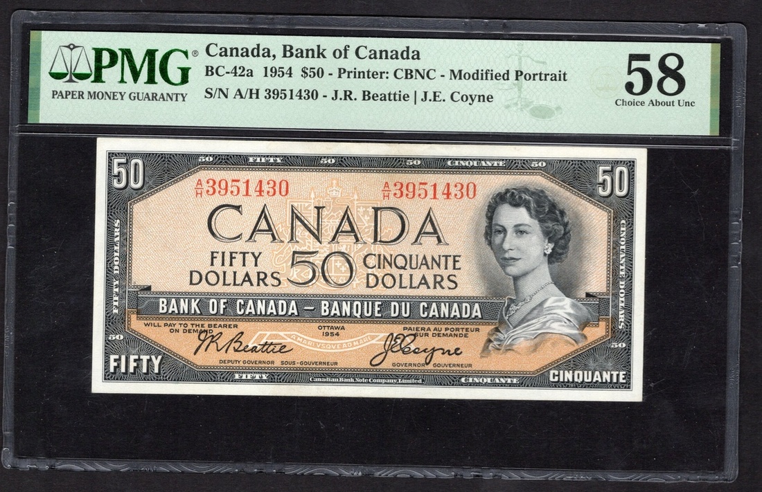 Canada. Bank of Canada. 50 Dollars. 1954 Series. P-81a, BC-42a. Signature: Beattie-Coyne (1955-61). Modified portrait; Atlantic coastline on back. PMG Choice About Unc 58.