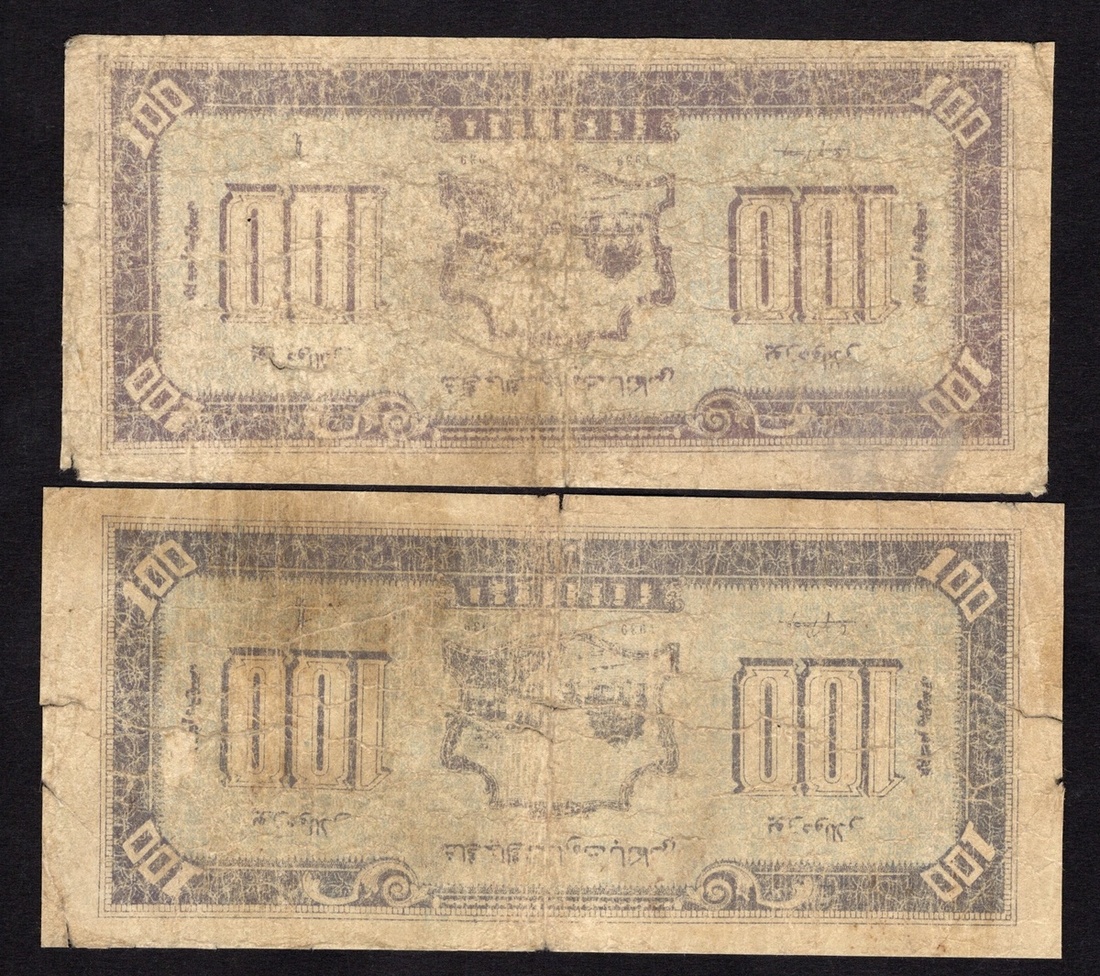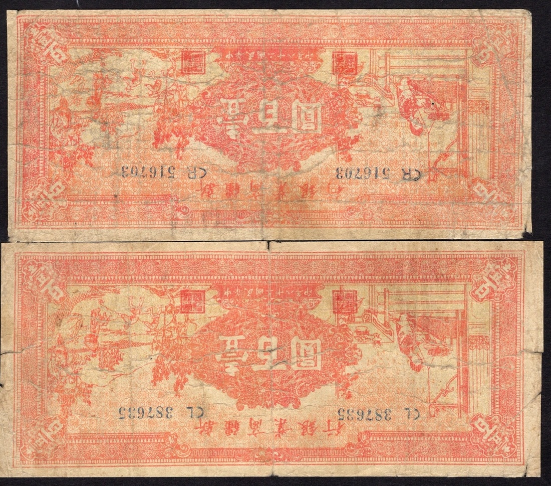 China. Xinjiang (Sinkiang). Sinkiang Commercial and Industrial Bank. Pair of 100 Yuan. 1939. P-S1754. Reddish-orange. Woman weaving at left, men farming at right. Good-VG. [2]