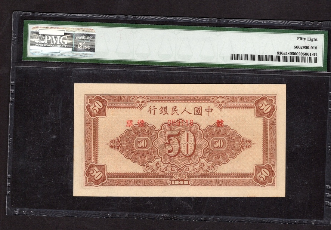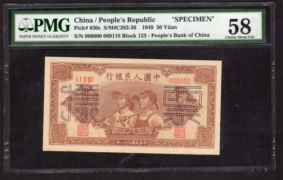 China. Peoples Republic. Peoples Bank of China. Specimen 50 Yuan. 1949. P-830s. No. 000000/069118, block 123. Brown. Farmer and laborer at center. Large black Chinese characters for "Specimen". PMG Choice About Unc 58.