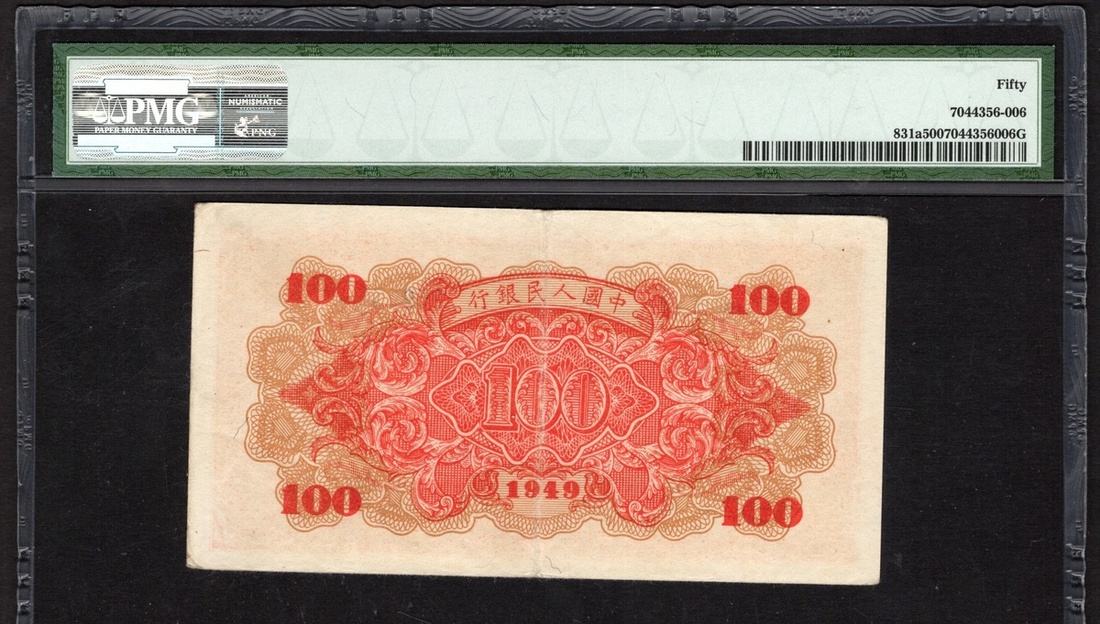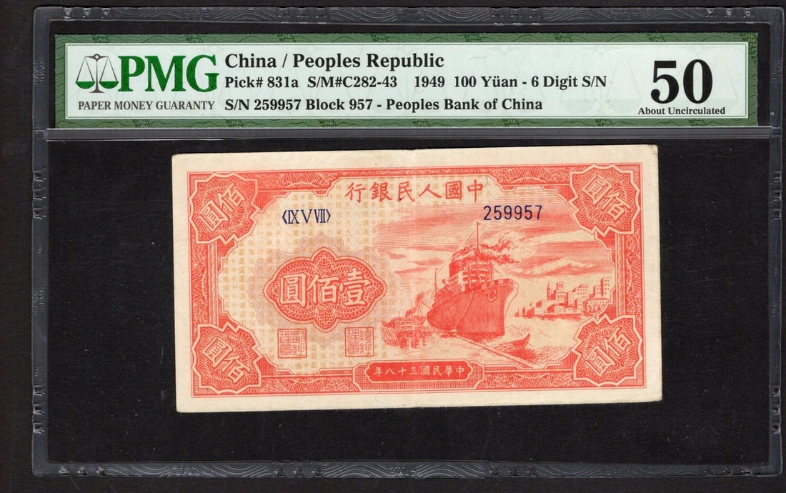 China. Peoples Republic. Peoples Bank of China. 100 Yuan. 1949. P-831a. No. 259957, block 957. Red, purple and red guilloche. Ship docked at right. PMG About Uncirculated 50.