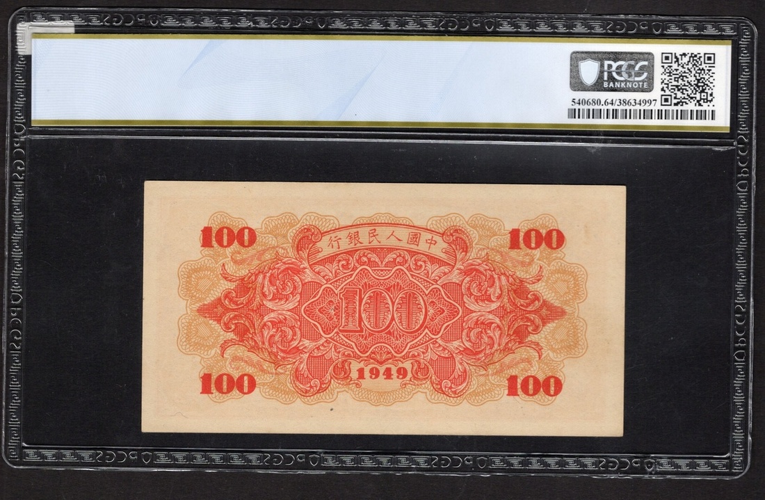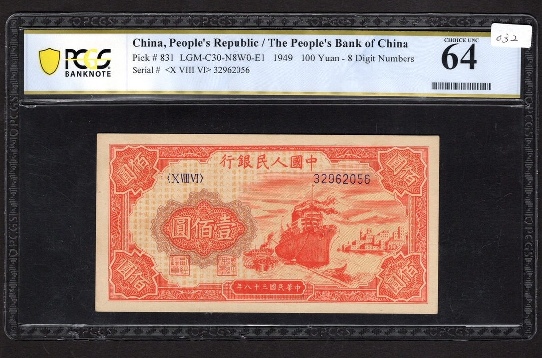 China. Peoples Republic. Peoples Bank of China. 100 Yuan. 1949. P-831b. Eight-digit Serial No. 32962056, block 1086. Red, purple and red guilloche. Ship docked at right. PCGS Choice Unc 64.
