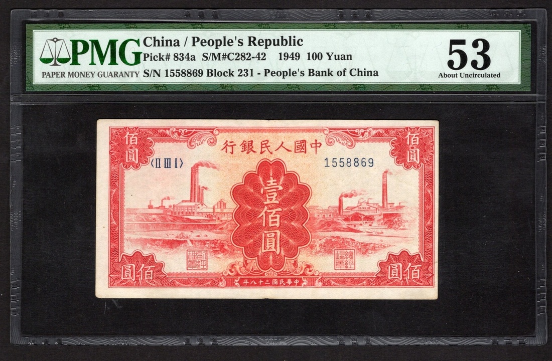 China. Peoples Republic. Peoples Bank of China. 100 Yuan. 1949. P-834a. No. 1558869, block 231. Red; light yellow-brown back. Factories at left and right. Scarcer design type. PMG About Uncirculated 53.