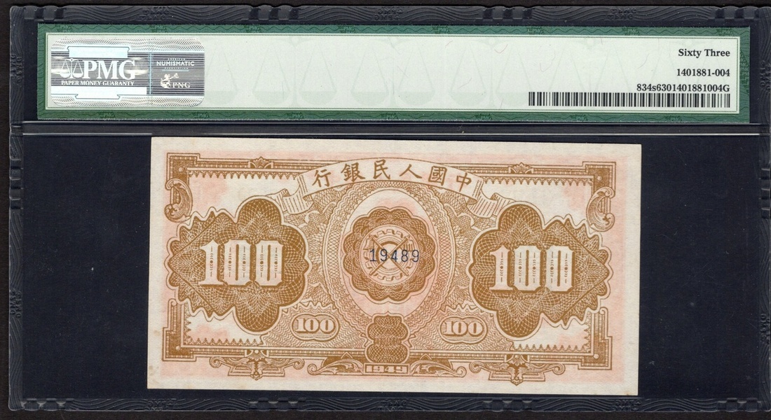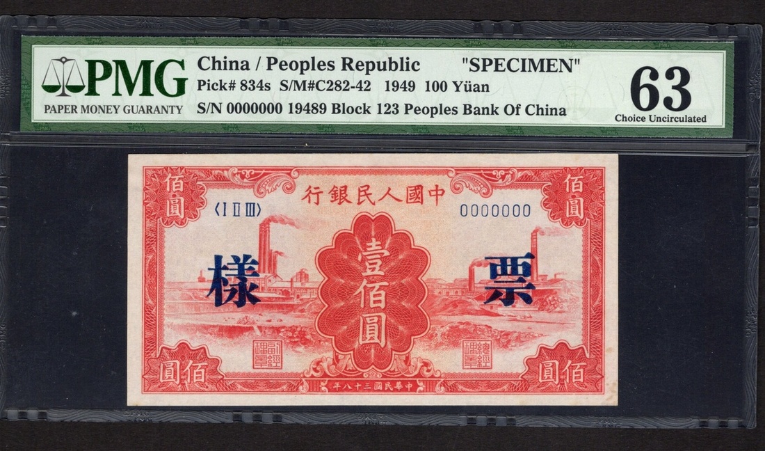 China. Peoples Republic. Peoples Bank of China. Specimen 100 Yuan. 1949. P-834s. No. 0000000/19489, block 123. Red; brown back. Factories at left and right. Scarcer design type. PMG Choice Uncirculated 63.