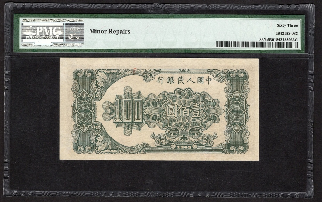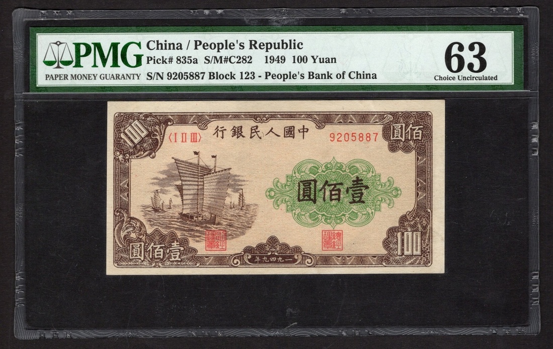China. Peoples Republic. Peoples Bank of China. 100 Yuan. 1949. P-835a. No. 9205887, block 123. Brown, green guilloche on pale pink; dark green back. Sampans at left. PMG Choice Uncirculated 63, minor repairs. A high-grade example of this rare and desirable note.