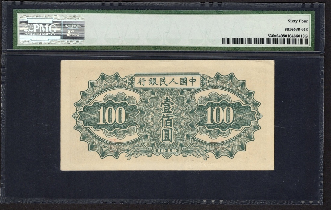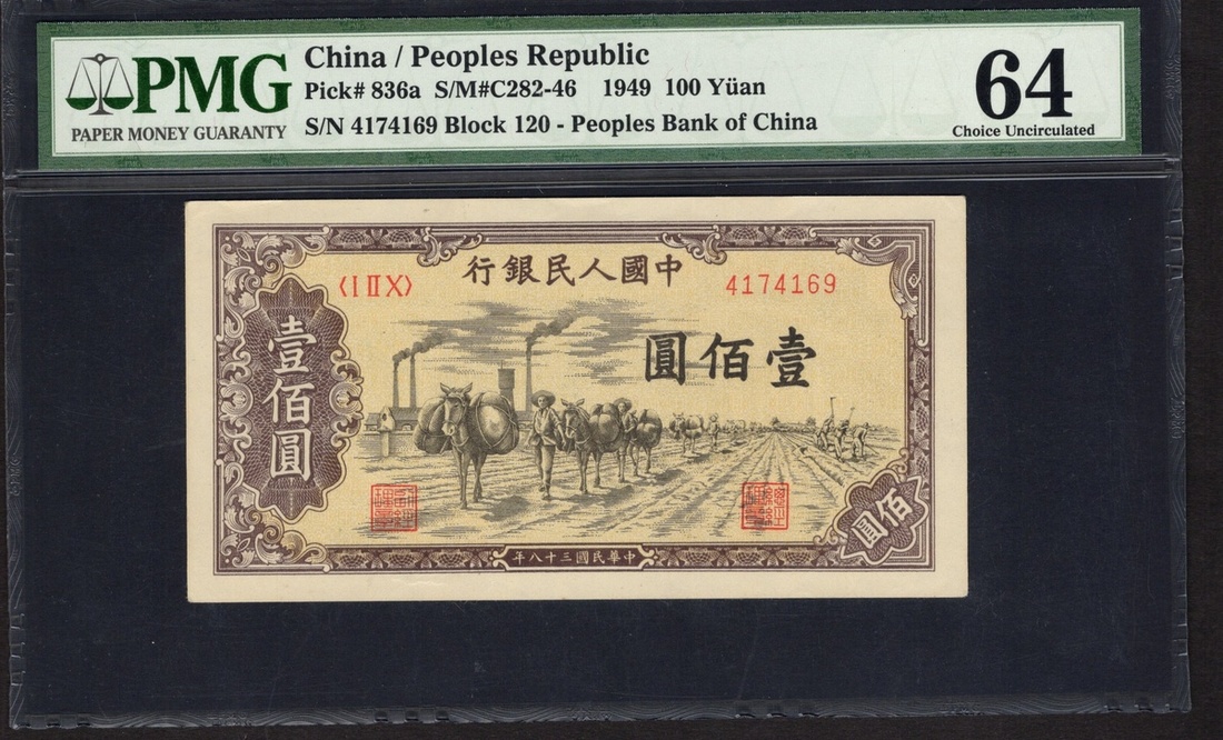 China. Peoples Republic. Peoples Bank of China. 100 Yuan. 1949. P-836a. No. 4174169, block 120. Brown and black on light gold; blue-green back. Donkey train, factories in the background. PMG Choice Uncirculated 64.
