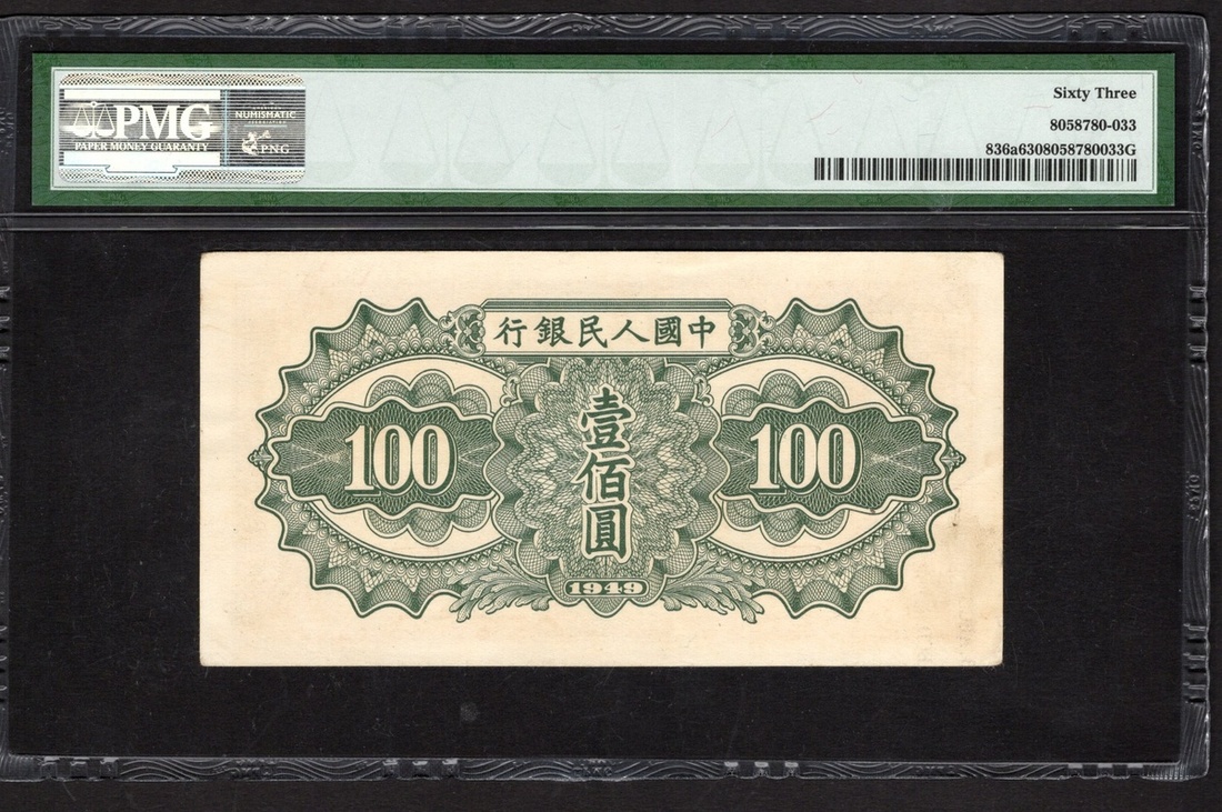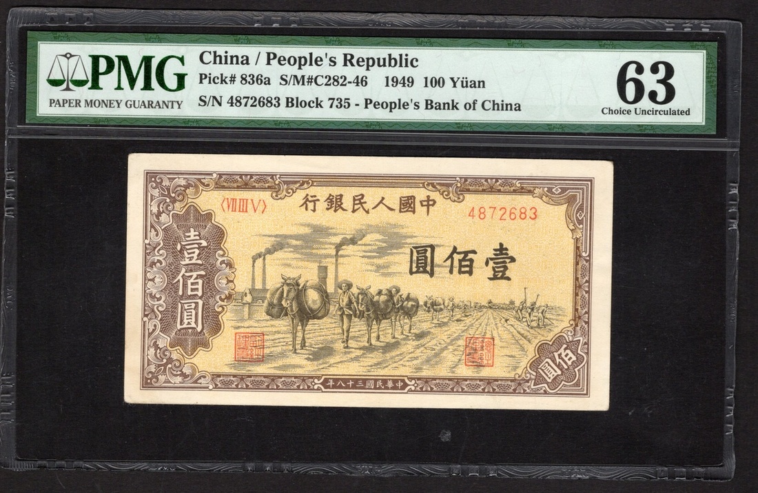 China. Peoples Republic. Peoples Bank of China. 100 Yuan. 1949. P-836a. No. 4872683, block 735. Brown and black on light gold; blue-green back. Donkey train, factories in the background. PMG Choice Uncirculated 63.