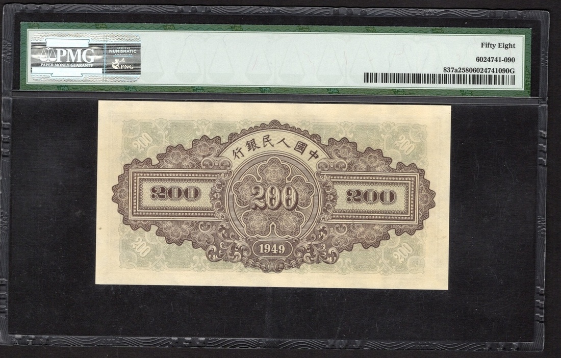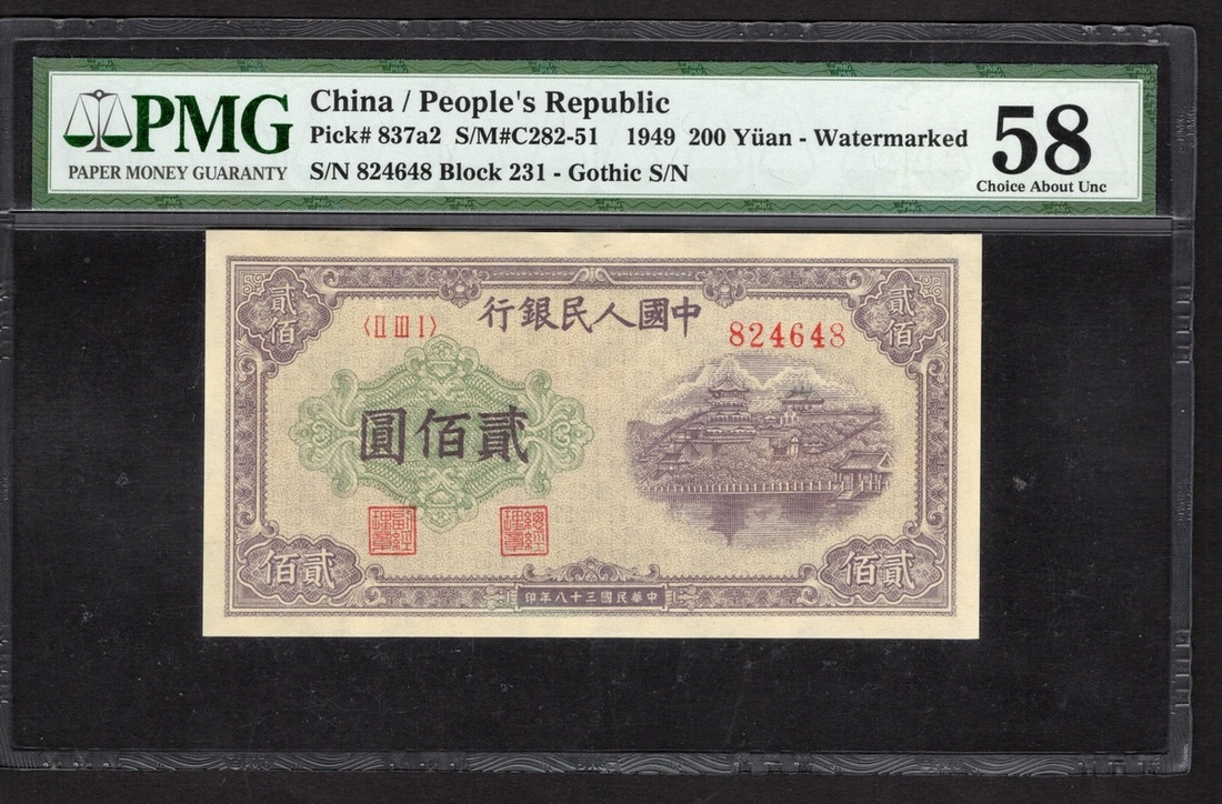 China. Peoples Republic. Peoples Bank of China. 200 Yuan. 1949. P-837a2. Gothic Serial No. 824648, block 231. Lilac-brow, green guilloche; dark brown on light olive back. Pagoda by shoreline on right. PMG Choice About Unc 58.