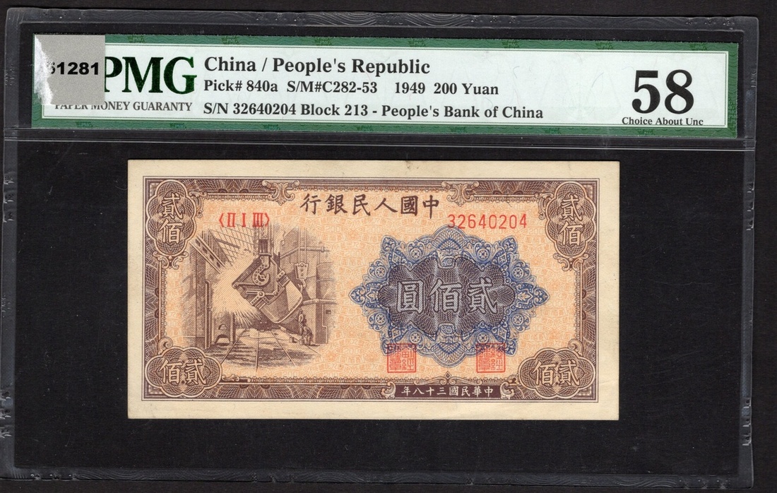 China. Peoples Republic. Peoples Bank of China. 200 Yuan. 1949. P-840a. No. 32640204, block 213. Brown on orange, blue and black guilloche. Steel plant at left. PMG Choice AU 58.