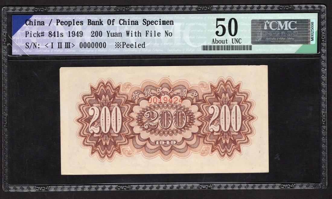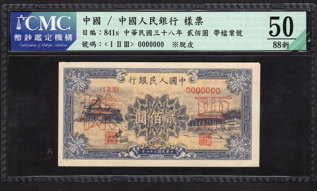 China. Peoples Republic. Peoples Bank of China. 200 Yuan. 1949. P-841s. No. 0000000/0019424, block 123. Blue on light orange; red-brown back. Bronze cow before building at left, bridge at right. Rare. Large red outlined Chinese characters for "Specimen" front. CMC About Unc 50; peeled.