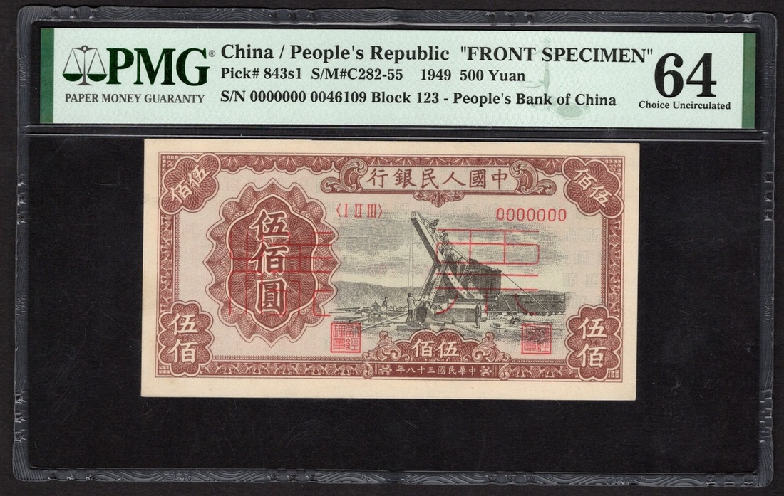 China. Peoples Republic. Peoples Bank of China. Front Specimen 500 Yuan. 1949. P-843s1. No. 0000000/0046109, block 123. Brown and black. Steam shovel at right. PMG Choice Uncirculated 64.