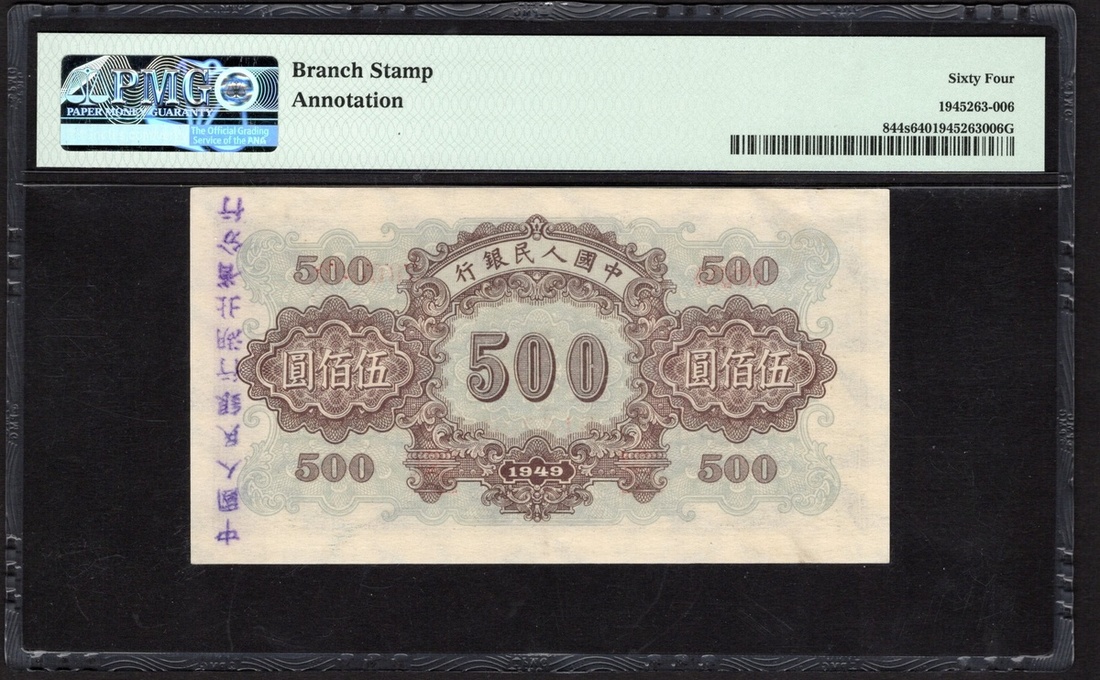 China. Peoples Republic. Peoples Bank of China. Specimen 500 Yuan. 1949. P-844s. No. 000000/016207, block 380. Black on lilac; dark brown on light blue back. City gate at center. Large red outlined Chinese characters for "Specimen" on front. PMG Choice Uncirculated 64, branch stamp, annotation.