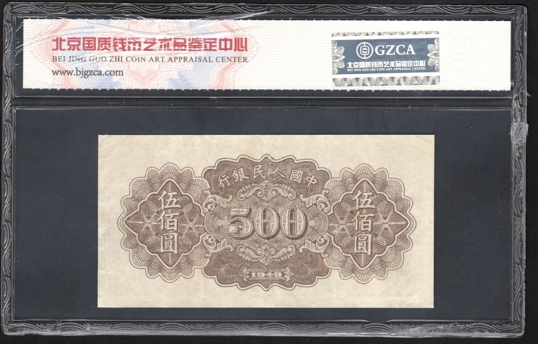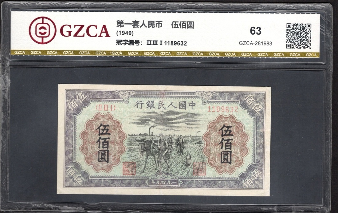 China. Peoples Republic. Peoples Bank of China. 500 Yuan. 1949. P-845a. No. 1189632, block 231. Violet and black, carmine guilloches on light blue; brown back. Farmers plowing with mule at center. GZCA 63.