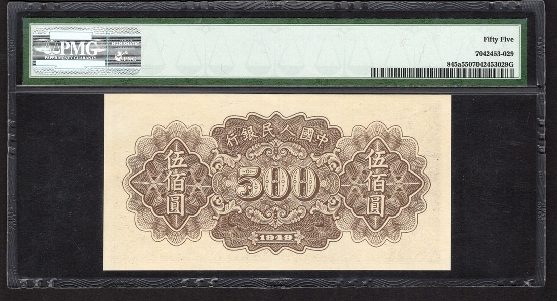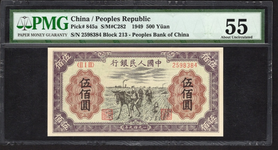 China. Peoples Republic. Peoples Bank of China. 500 Yuan. 1949. P-845a. No. 2598384, block 213. Violet and black, carmine guilloches on light blue; brown back. Farmers plowing with mule at center. PMG About Uncirculated 55.