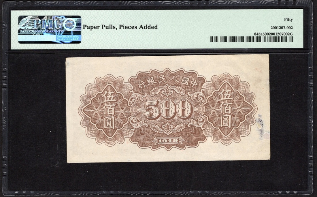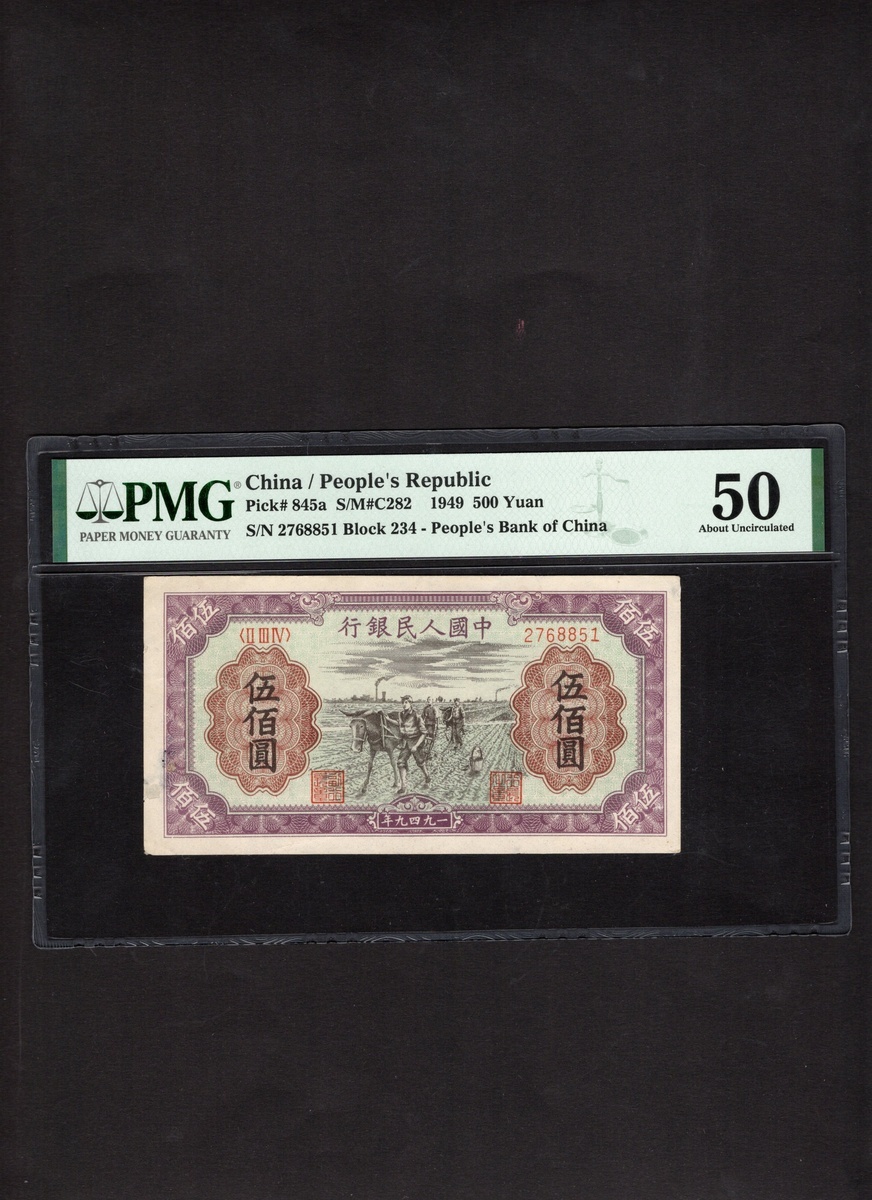 China. Peoples Republic. Peoples Bank of China. 500 Yuan. 1949. P-845a. No. 2768851, block 234. Violet and black, carmine guilloches on light blue; brown back. Farmers plowing with mule at center. PMG About Uncirculated 50, paper pulls, pieces added.