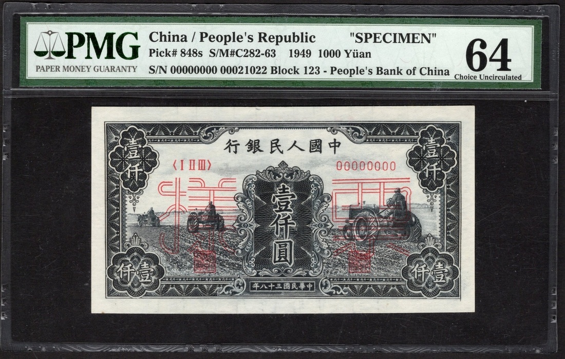 China. Peoples Republic. Peoples Bank of China. Front and Back Specimen 1000 Yuan. 1949. P-848f, bs. No. 0000000/00021022, block 123. Deep charcoal black. Tractors at left and right; field workers back center. Large red outlined Chinese characters for "Specimen" on front and back. PMG Choice Uncirculated 64 - the back EPQ.