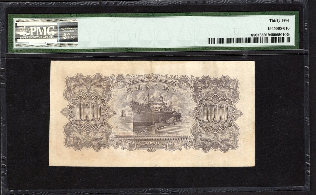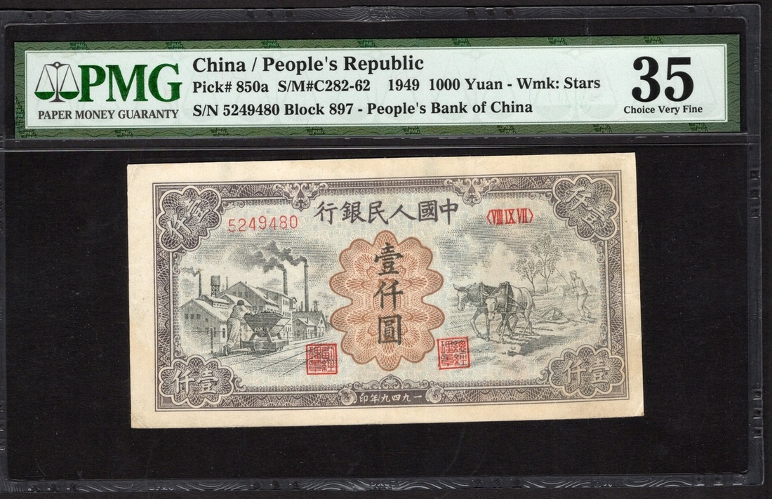 China. Peoples Republic. Peoples Bank of China. 1000 Yuan. 1949. P-850a. No.5249480, block 897. Lilac-gray, red-brown guilloche on light blue-green and brown. Factory and man pushing ore hopper at left, farmer plowing with two donkeys at right; ship at dock back center. PMG Choice Very Fine 35.