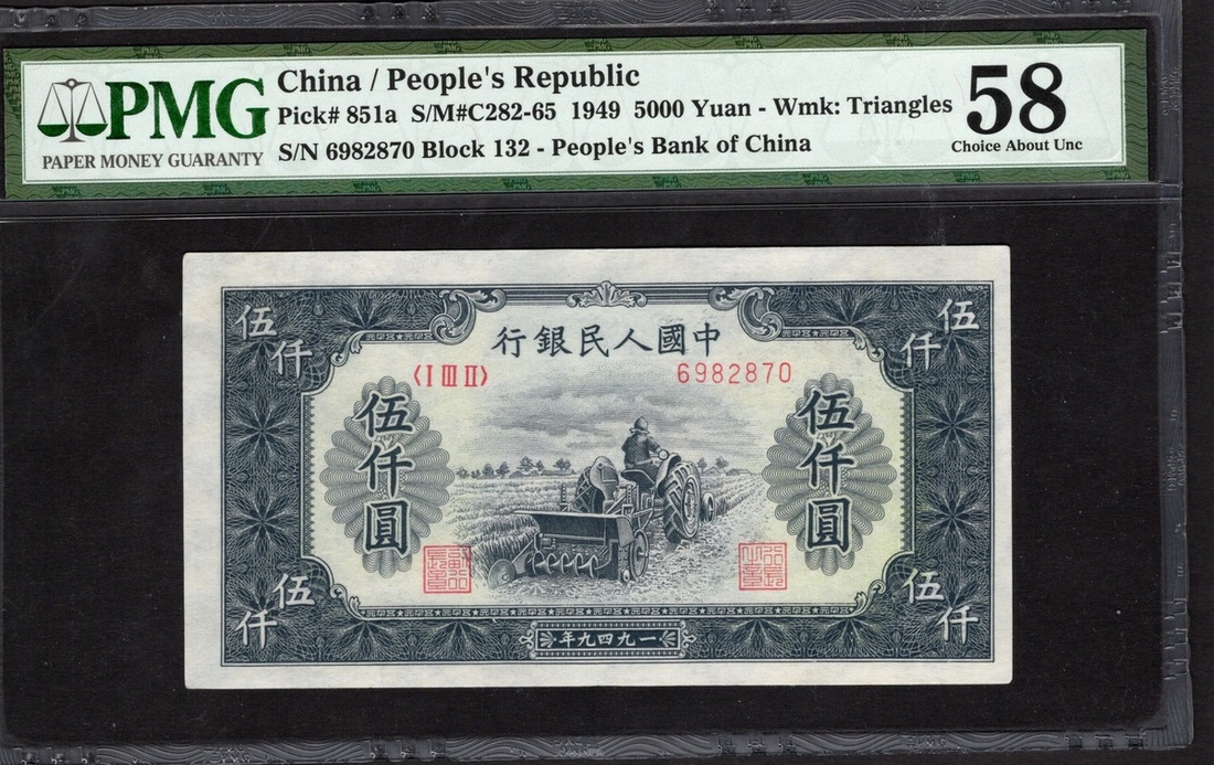 China. Peoples Republic. Peoples Bank of China. 5000 Yuan. 1949. P-851a. No. 6982870, block 132. Dark gray-green on light blue. Tractor tilling at center. PMG Choice About Unc 58.