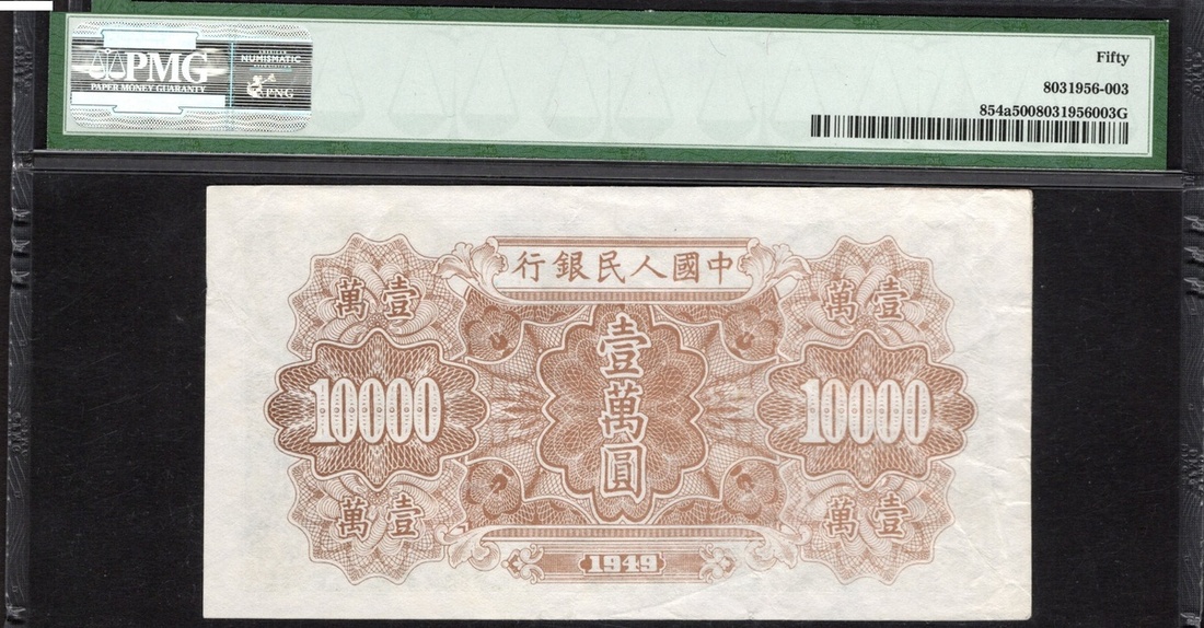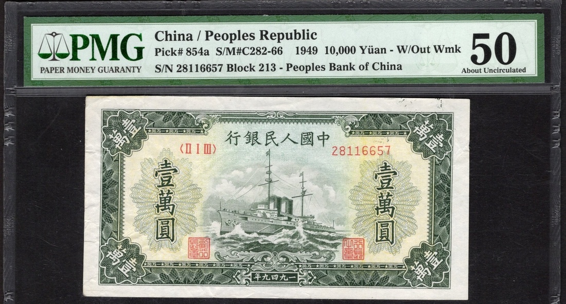 China. Peoples Republic. Peoples Bank of China. 10,000 Yuan. 1949. P-854a. No. 28116657, block 213. Dark emerald-green on multicolor; brown back Warship at center. PMG About Uncirculated 50.