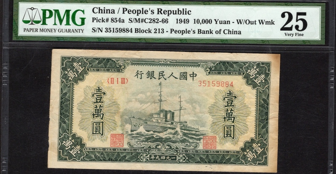 China. Peoples Republic. Peoples Bank of China. 10,000 Yuan. 1949. P-854a. No. 35159884, block 213. Dark emerald-green; brown back Warship at center. PMG Very Fine 25.
