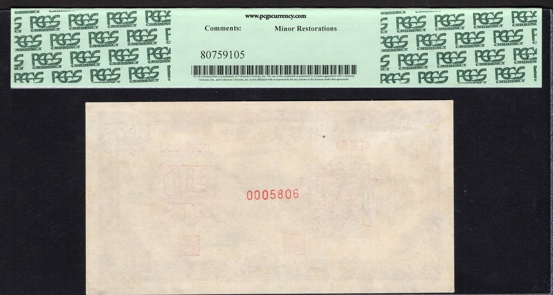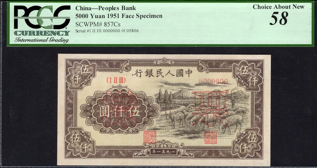 China. Peoples Republic. Peoples Bank of China. Front and Back Specimen 5000 Yuan. 1951. P-857Cf, bs. No.0000000/0005806, block 123. Purple and black on pale yellow; green back. Flock of sheep grazing at right; Uyghur Arabic legends on back. PCGS Choice About New 58, minor restorations, small stain on back.