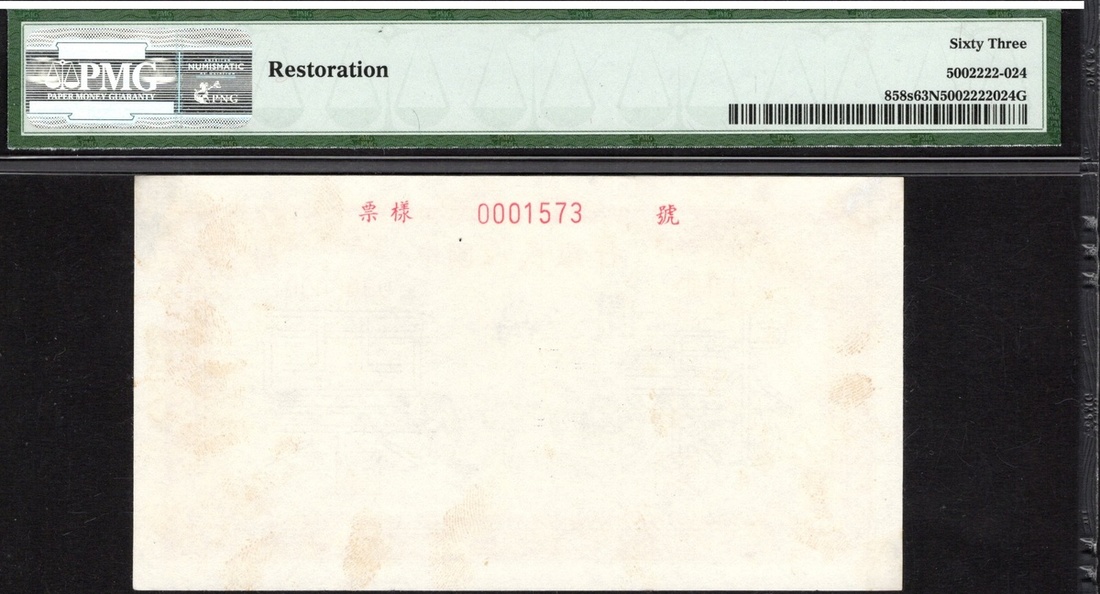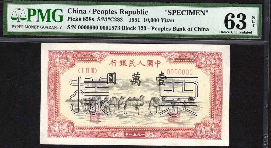 China. Peoples Republic. Peoples Bank of China. Front and Back Specimen 10,000 Yuan. 1951. P-858f&bs. No. 0000000/0001573, block 123. Deep carmine and black; on pale blue back. Camel caravan; Uyghur legends on back. Large black outlined Chinese characters for "Specimen" both sides. PMG Choice Uncirculated Net 63, restoration.