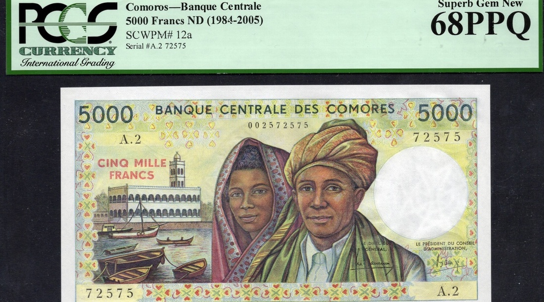 Comoros. Banque Centrale des Comores. 5000 Francs. P-12a. No. A.2 72575. Green on multicolor. Man and woman at center, botas and building at left; President Djohr back center. PCGS Super Gem New 68 PPQ.