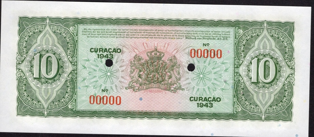 Curaçao. Curaçaosche Bank. Specimen 10 Gulden. 1943. P-26s. No. 00000. Green. Ships dockside at center, woman seated beneath palm at left. Red diagonal SPECIMEN front, two punches. AU.