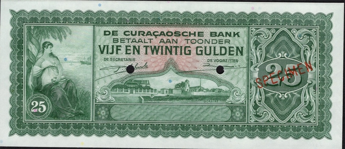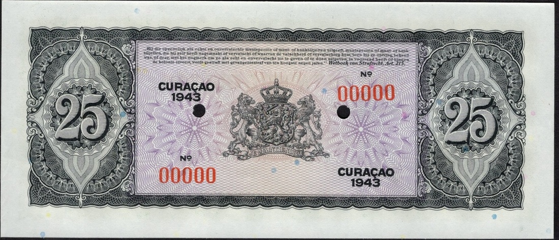 Curaçao. Curaçaosche Bank. Specimen 25 Gulden. 1943. P-27s. No. 00000. Green. Ships dockside at center, woman seated beneath palm at left. Red diagonal SPECIMEN front, two punches. AU.