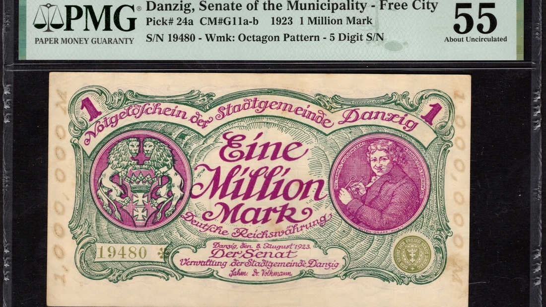 Danzig. Free City. Senate of the Municipality. 1 Million Mark. 1923. P-24a. No. 19480. Lilac and green. Arms at left, Chodowiecki at right; ornate gateway on back. PMG About Uncirculated 55, minor stains.