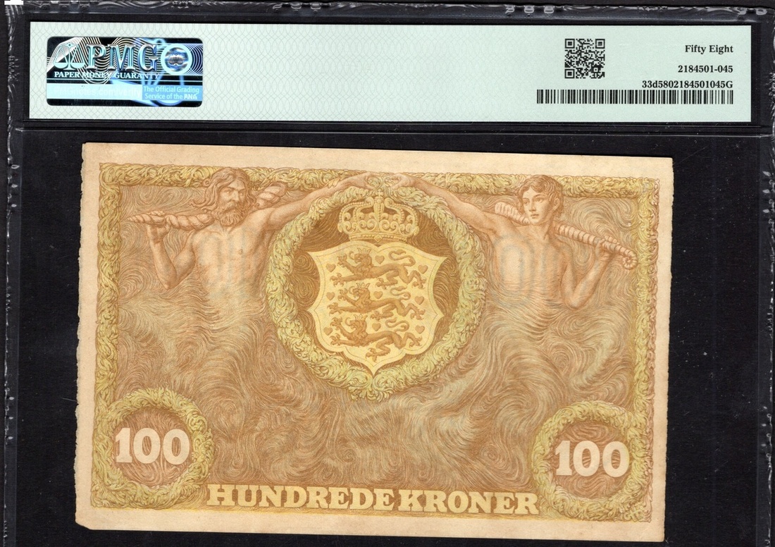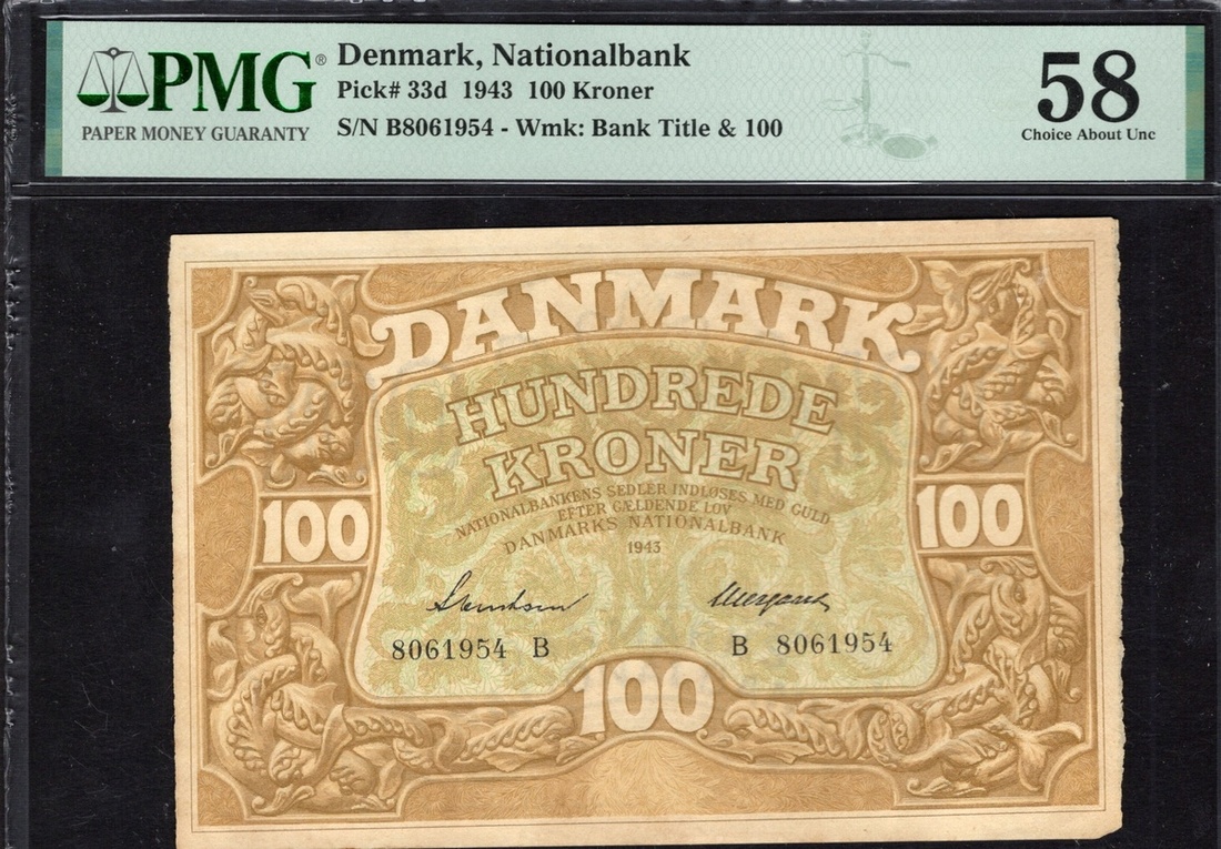 Denmark. Nationalbank. 100 Kroner. 1943. P-33d. No. B8061954. Brown-yellow. Border of dolphins; Arms in a wreath of seaweed, supported by mermen. PMG Choice About Unc 58.