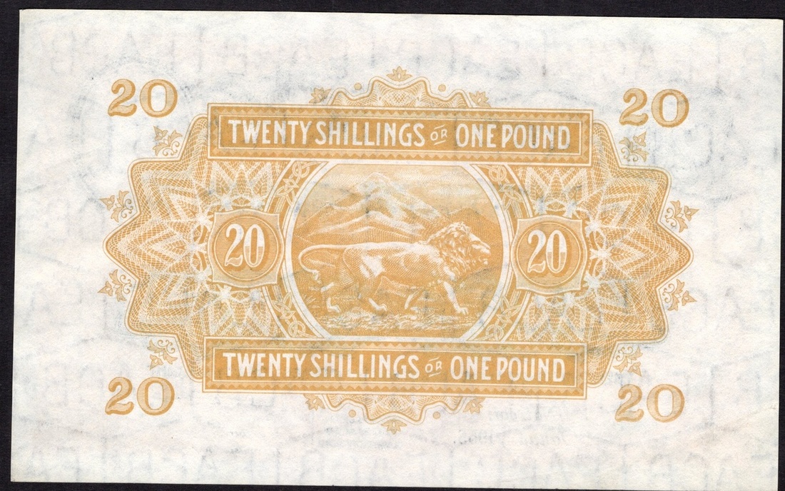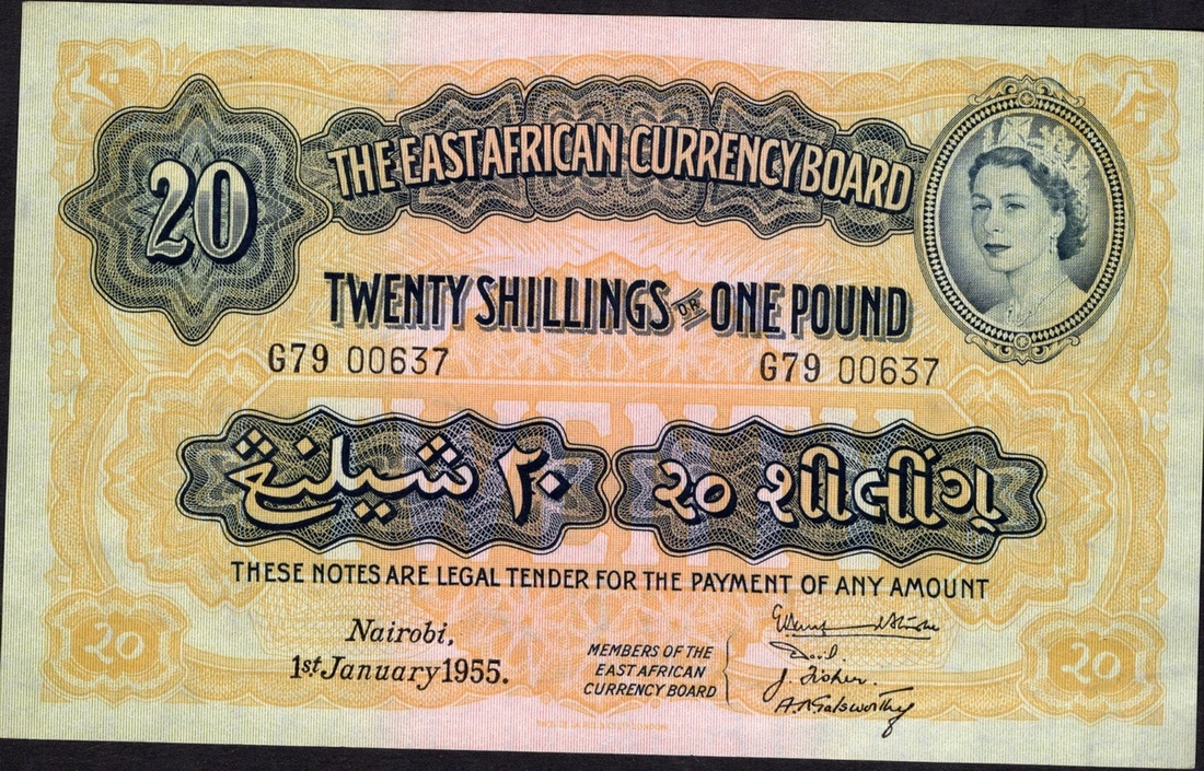 East Africa. East African Currency Board. 20 Shillings=1 Pound. 1 January 1955. P-35. No. G79 00637. Blue-black on yellow and orange. Queen Elizabeth portrait upper gith, value in Amharic and Arabic; Lion and mountain peak on back. TDLR. About Uncirculated.