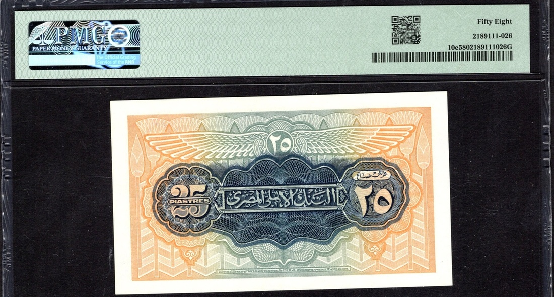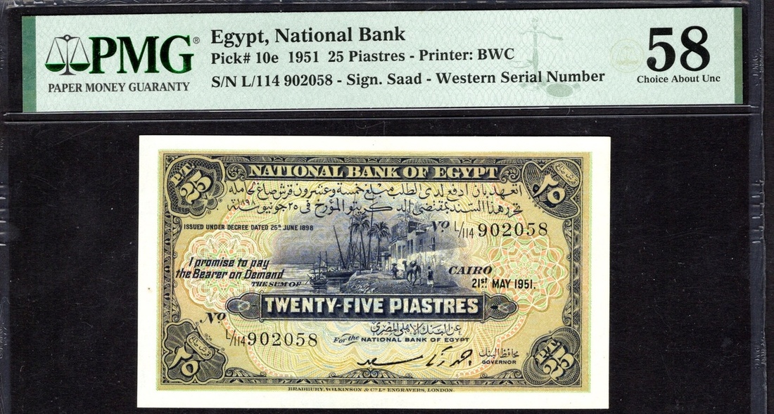 Egypt. Kingdom. National Bank of Egypt. 25 Piastres. 1951. P-10e. Signed: Saad; western serial number: 902058. Deep purple on multicolor. Village on banks of Nile at center. PMG Choice About Unc 58.