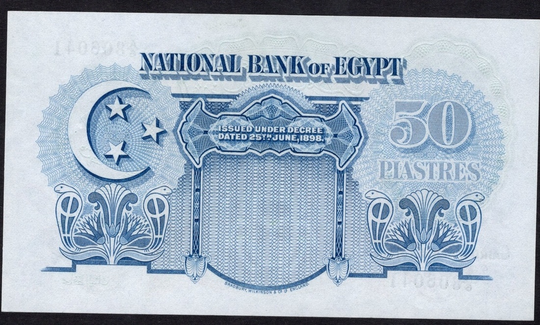 Egypt. Kingdom. National Bank of Egypt. 50 Piastres (`Irsh). 12 March 1938. P-21a. No. A/6 806041. Signature: Cook. Green on multicolor; blue and light blue-gray back. Tutankhamen at left. About Uncirculated.