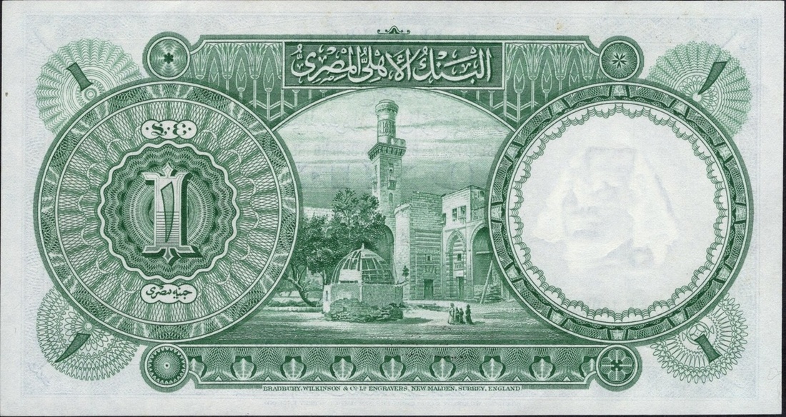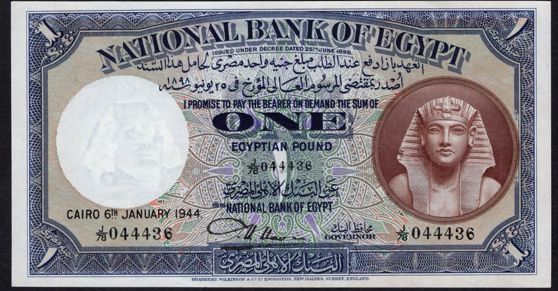 Egypt. Kingdom. National Bank of Egypt. 1 Pound (Gi'ney). 6 January 1944. P-22c. No. J/78 044436. Signature: Nixon. Blue and brown on multicolor; Green back. Facing Tutankhamen at right; Qala'un Mosque on back. Crisp Uncirculated.