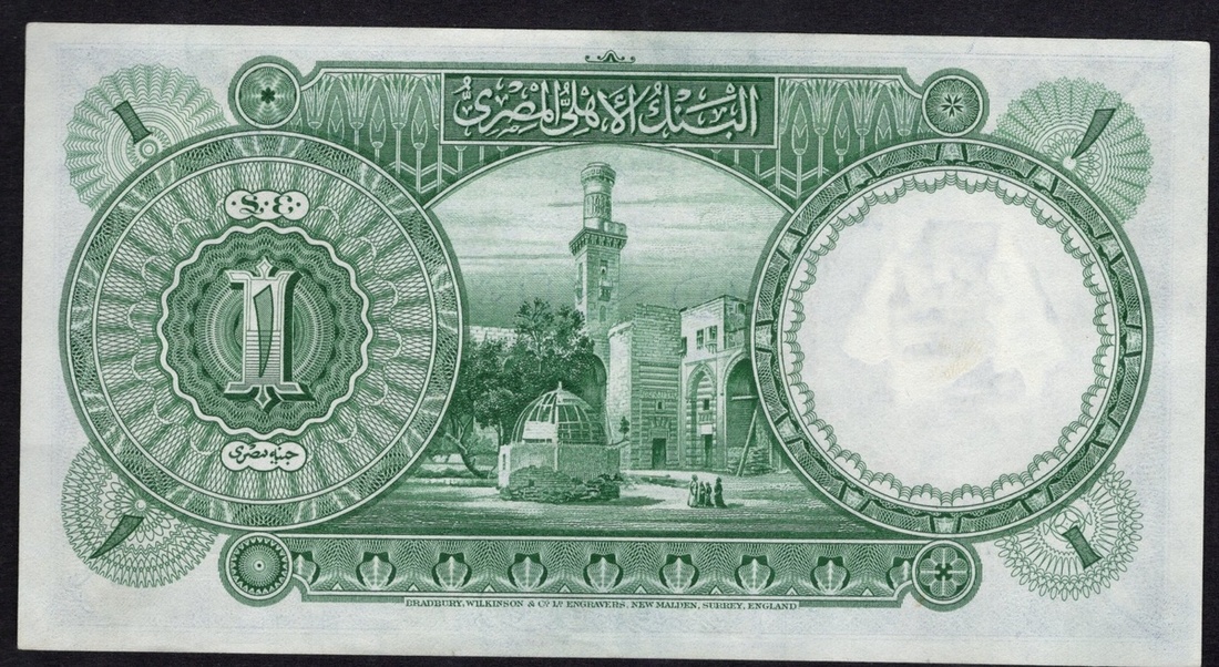 Egypt. Kingdom. National Bank of Egypt. 1 Pound (Gi'ney). 19 May 1948. P-22d. No. J/101 441512. Signature: Leith-Ross. Blue and brown on multicolor; Green back. Facing Tutankhamen at right; Qala'un Mosque on back. Crisp Uncirculated.