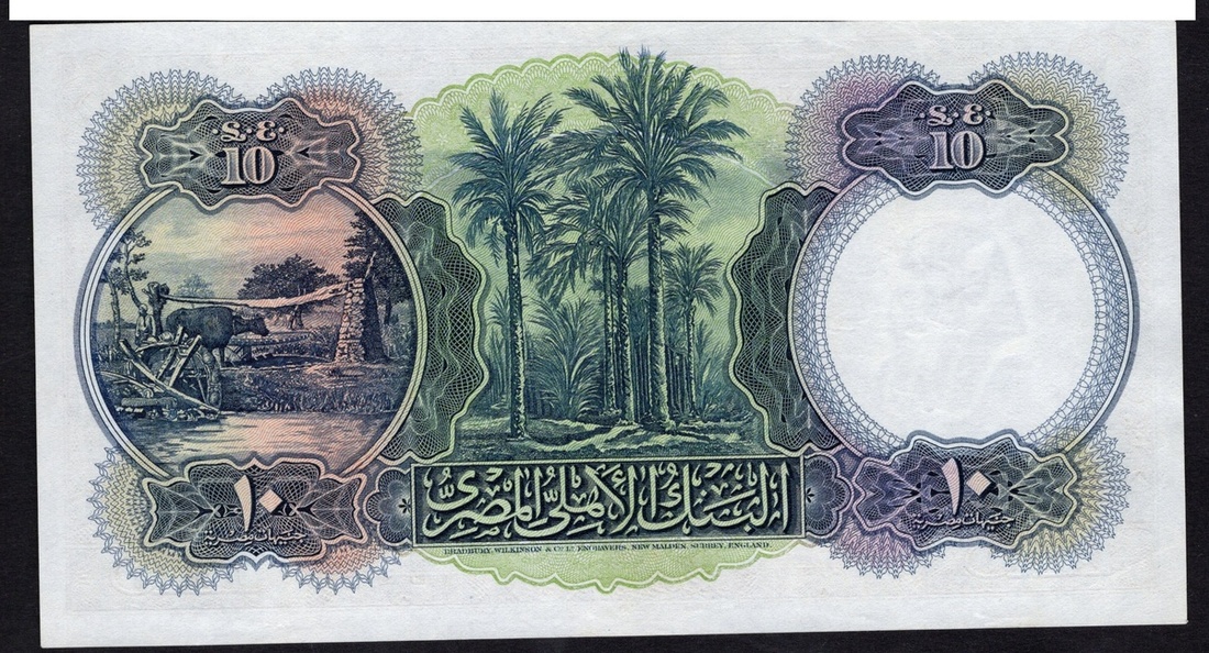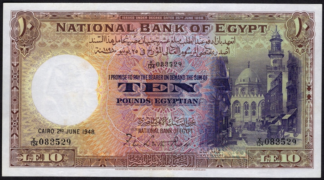 Egypt. Kingdom. National Bank of Egypt. 10 Pounds (Gi'ney). 2 June 1948. P-23c. No. X/124 083529. Signature: Leith-Ross. Brown, yellow-green on multicolor. Sharia al-Mu'izz with Qala'un Mosque in background; Plam trees at center, farming scene at left on back. Choice AU.