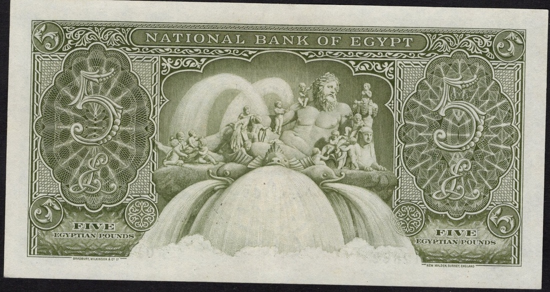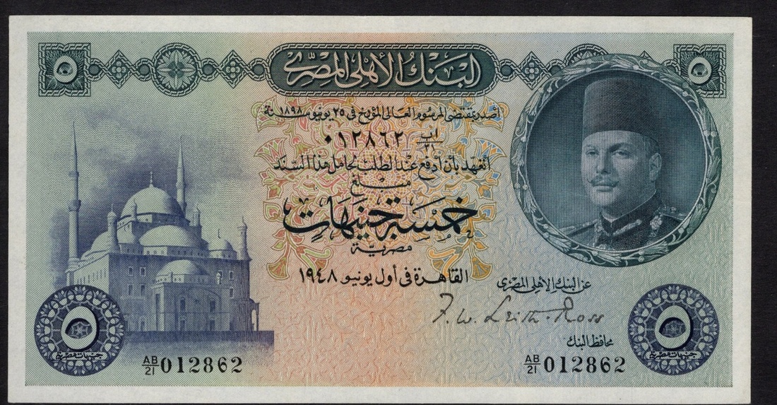 Egypt. Kingdom. National Bank of Egypt. 5 Pounds (Giney). 1948. P-25a. No. AB/21 012862. Malik Farouk at right, Muhammad `Ali Mosque at left; Statue of Nilus with his 16 children on back. Crisp. Choice Extremely Fine.