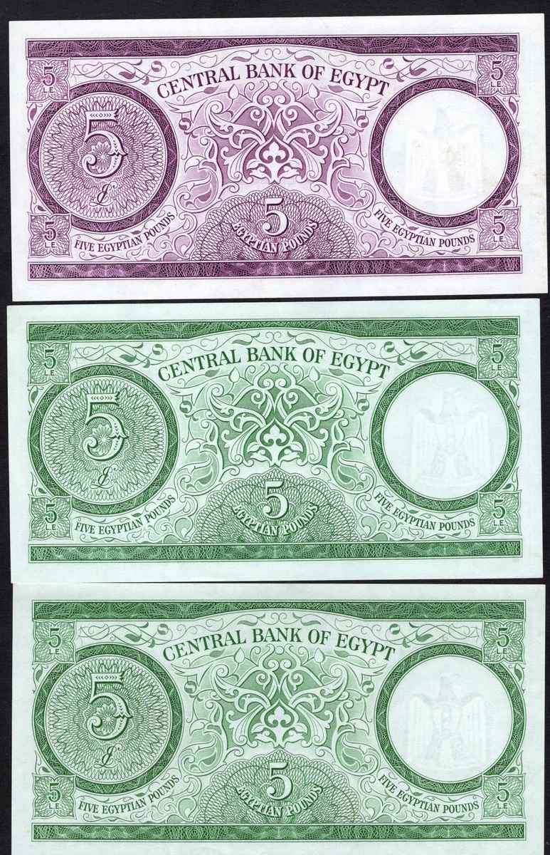 Egypt. Republic. Trio of 5 Pound notes. 7 December 1963; 17 May 1964. P-39. Green and brown on multicolor. The latter, slight teller handling; and 18 October 1964. P-40. Lilac and brown on multicolor. Tutankhamen at right. Crisp Uncirculated. [3]