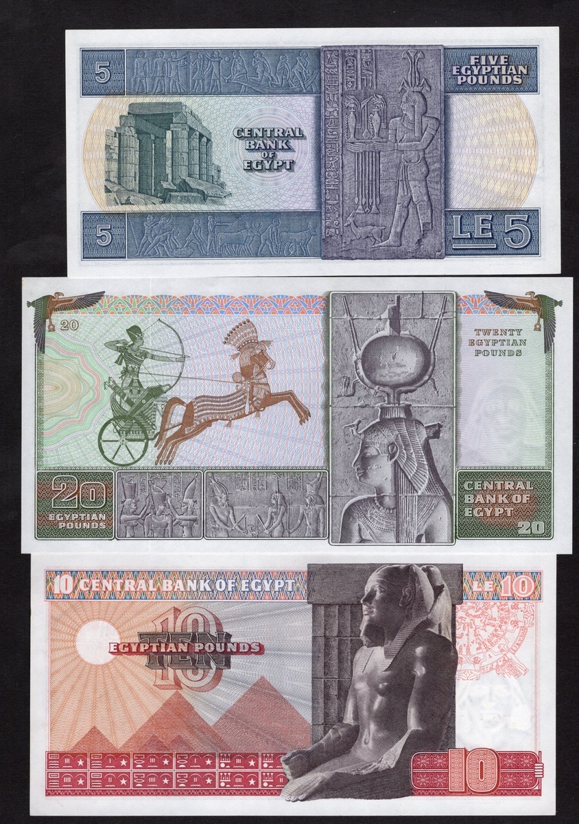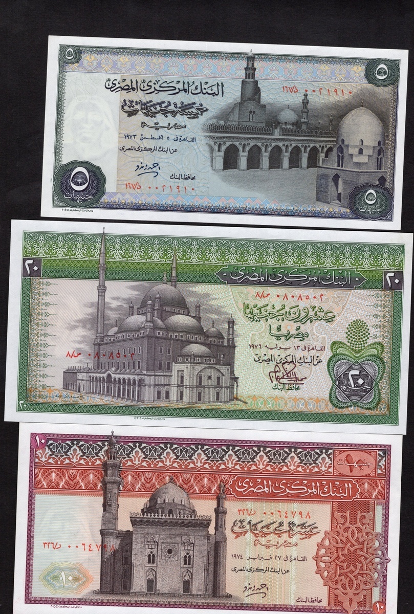 Egypt. Republic. Central Bank of Egypt. Trio: 5 Pounds (Gi'ney). 1973. P-45. Ibn Tulun Mosque; 10 Pounds. 1974. P-46. Sultan Hasan Mosque. 20 Pounds (Gi'ney). 1976. P-48. Muhammad `Ali Mosque. Pharaonic themed backs. Choice crisp Uncirculated. [3]