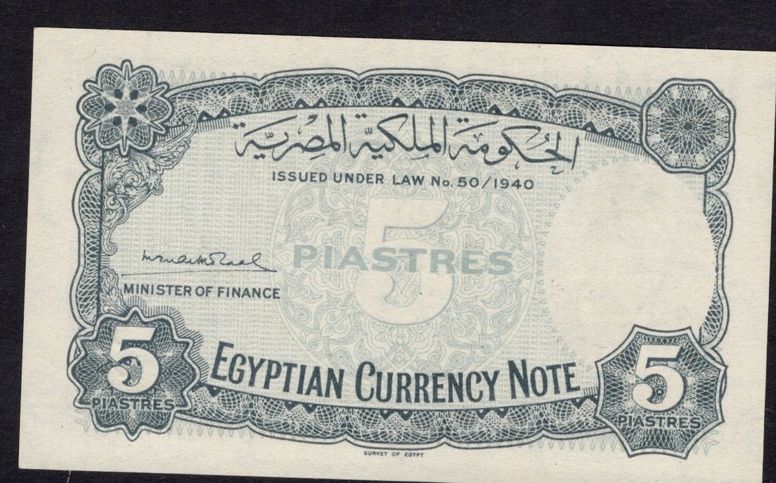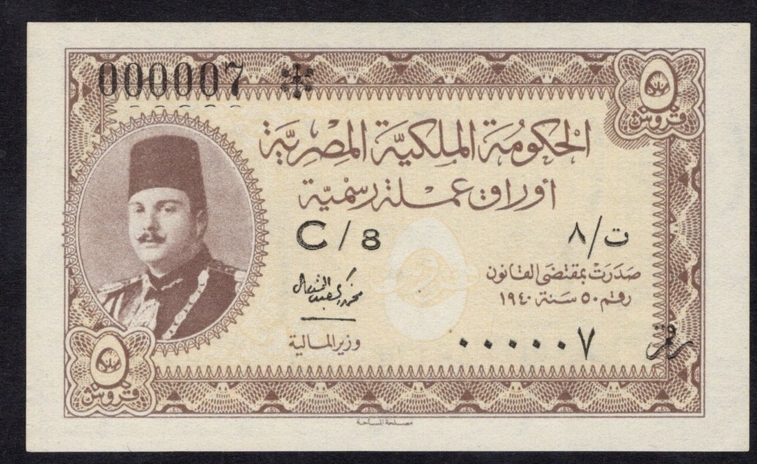 Egypt. Kingdom. Egyptian Government. 5 Piastres (`Irsh). ND. P-165a. No. C/8 000007. Brown on yellow; Gray-blue back. Malik Farouk at left. Scarce very low number note. Crisp Uncirculated.