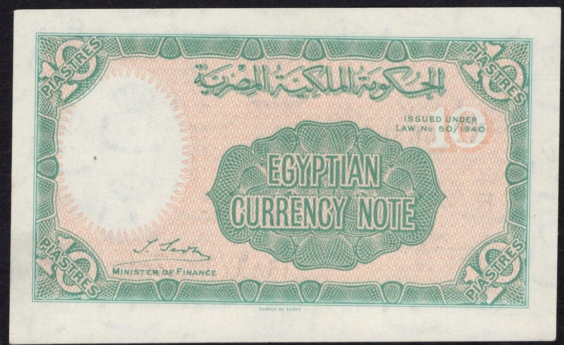 Egypt. Kingdom. Egyptian Government. 10 Piastres (`Irsh). ND. P-168a. No. R/4 668676. Blue on green; Green on pink back. Malik Farouk at right. Crisp Uncirculated.
