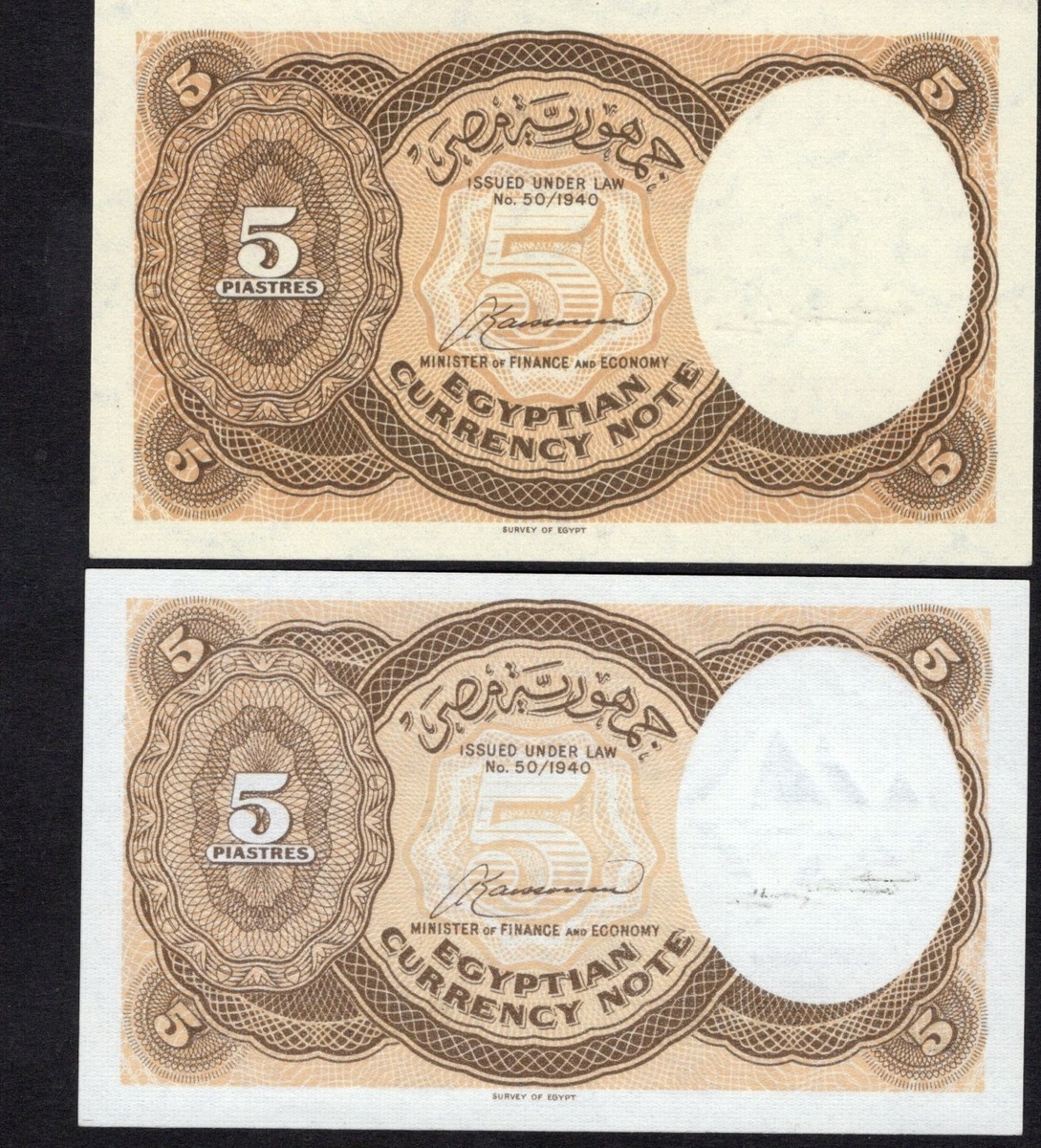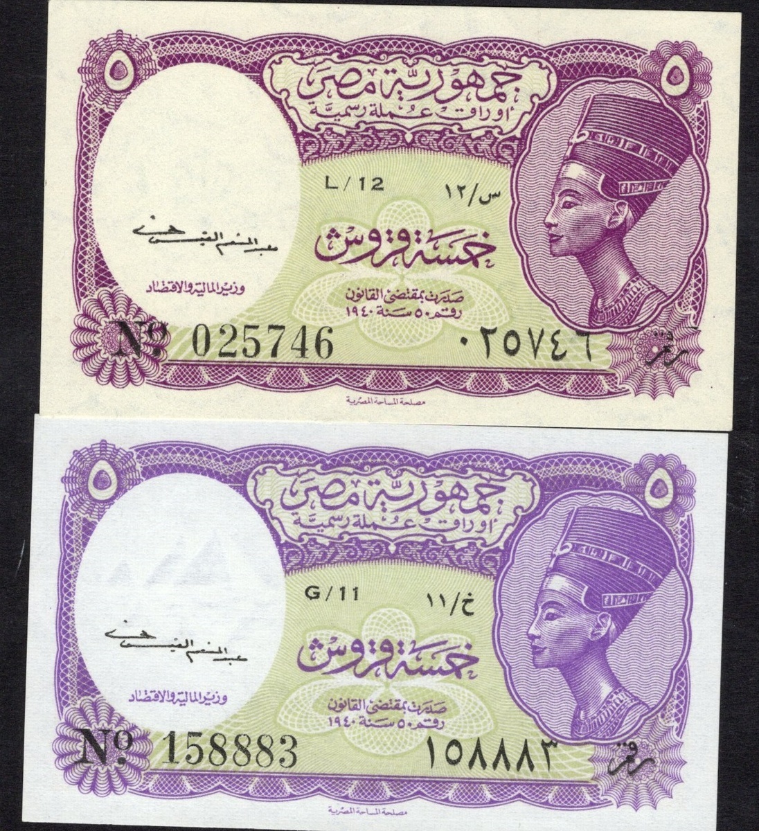 Egypt. Republic. Egyptian Government. Variety pair of 5 Piastres ('Irsh). ND (1952-58). P-174a, b. Lilac and yellow-green; Orange-brown back. Nefertiti at right. Crisp Uncirculated. [2]