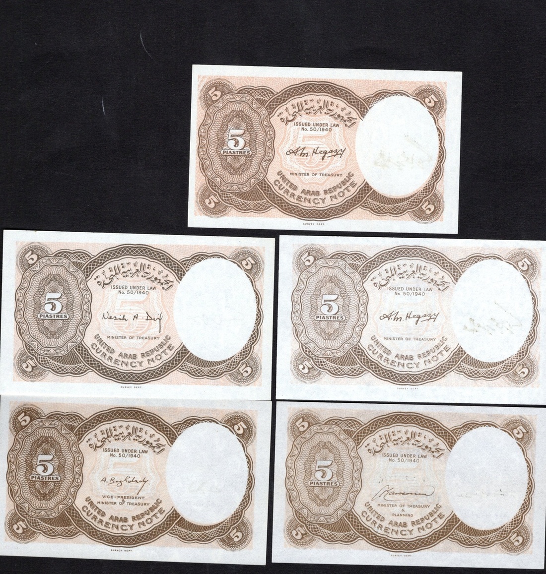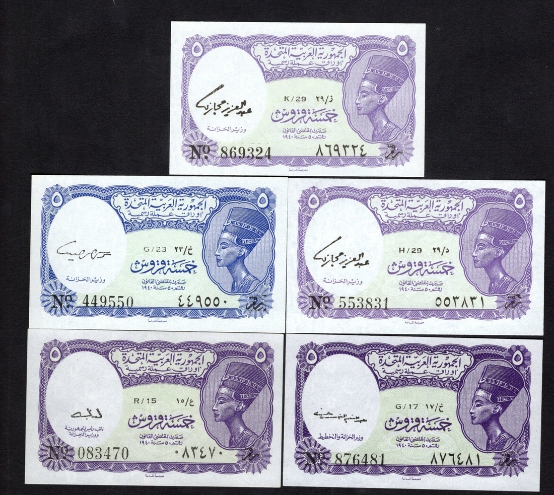 Egypt. United Arab Republic. Egyptian Government. Variety group of 1961 Issue 5 Piastres ('Irsh) . P-180a, b, d, e (2). Lilac and pale green, the third, blue and pale green; light brown backs. Nefertiti at right. Crisp Uncirculated. [5]