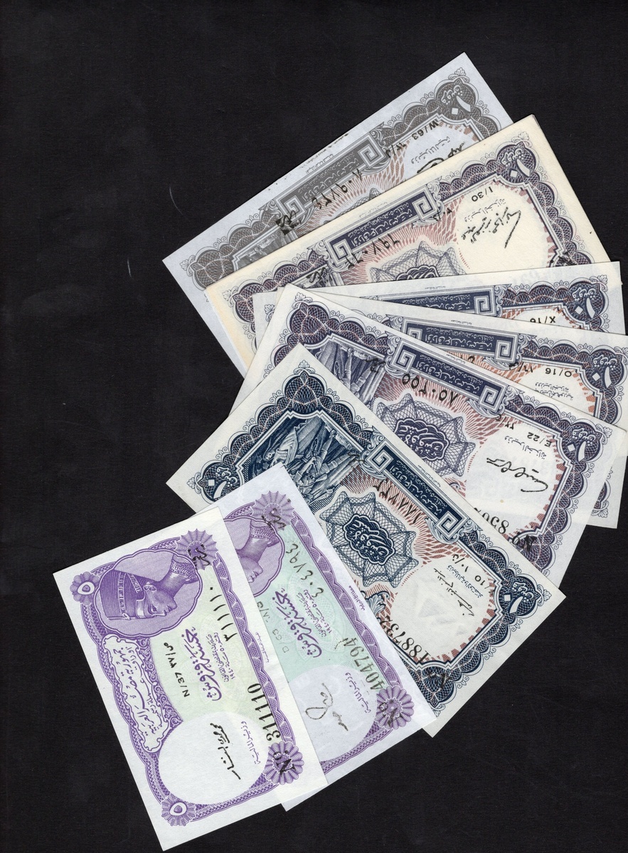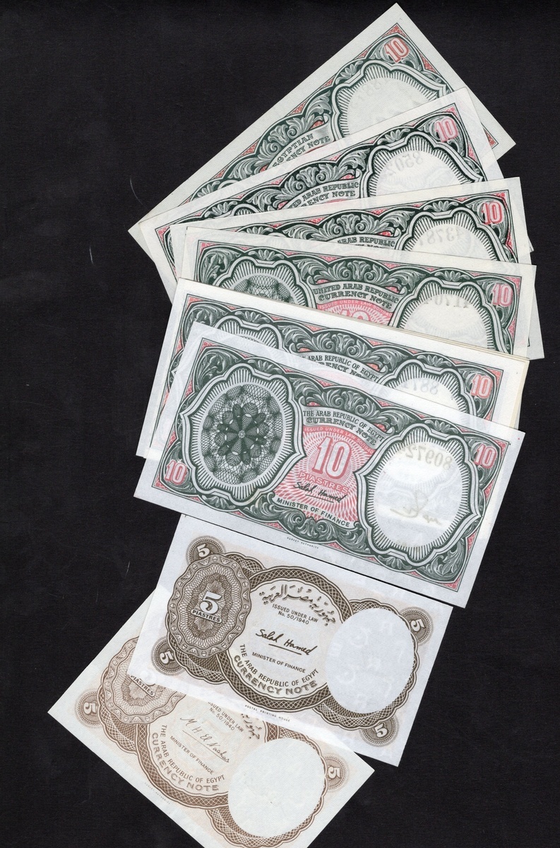 Egypt. UAR-Arab Republic. Type Group of 10 Piastres ('Irsh) (8). Includes. P-175a, 181a, b, d, 183a (2), f, and 184a. Marchers with flag at right. The first AU, the rest crisp Uncirculated; also 5 Piastres. P-182d, j. Uncirculated. [10]