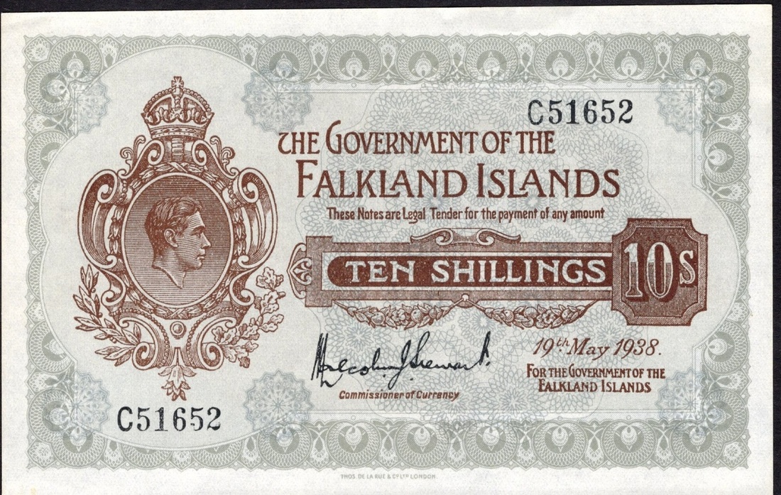 Falkland Islands. Government of the Falkland Islands. 10 Shillings. 1938. P-4. No. C51652. Brown on gray. George VI portrait at left. Light teller's handling. Uncirculated.