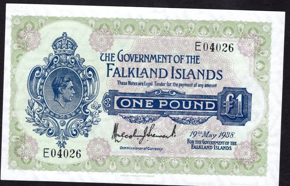 Falkland Islands. Government of the Falkland Islands. 1 Pound. 1938. P-5. No. E04026. Blue on green and lilac. George VI portrait at left. Uncirculated.