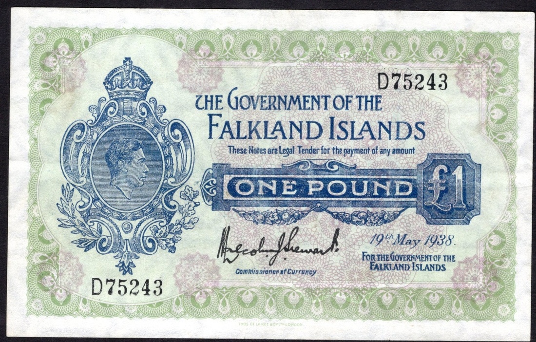 Falkland Islands. Government of the Falkland Islands. 1 Pound. 1938. P-5. No. D75243. Blue on green and lilac. George VI portrait at left. Extremely Fine.