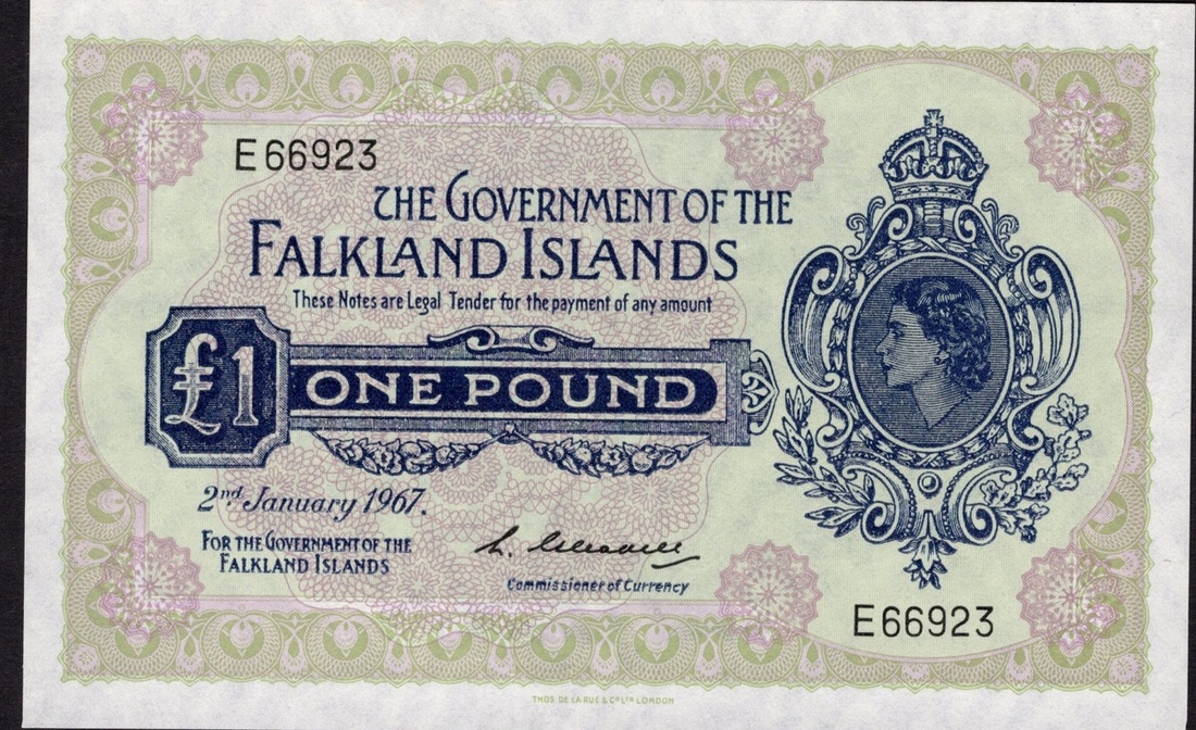Falkland Islands. Government of the Falkland Islands. 1 Pound. 1967. P-8a. No. E66923. Blue on green and lilac. Elizabeth II portrait at right. Crisp Uncirculated.